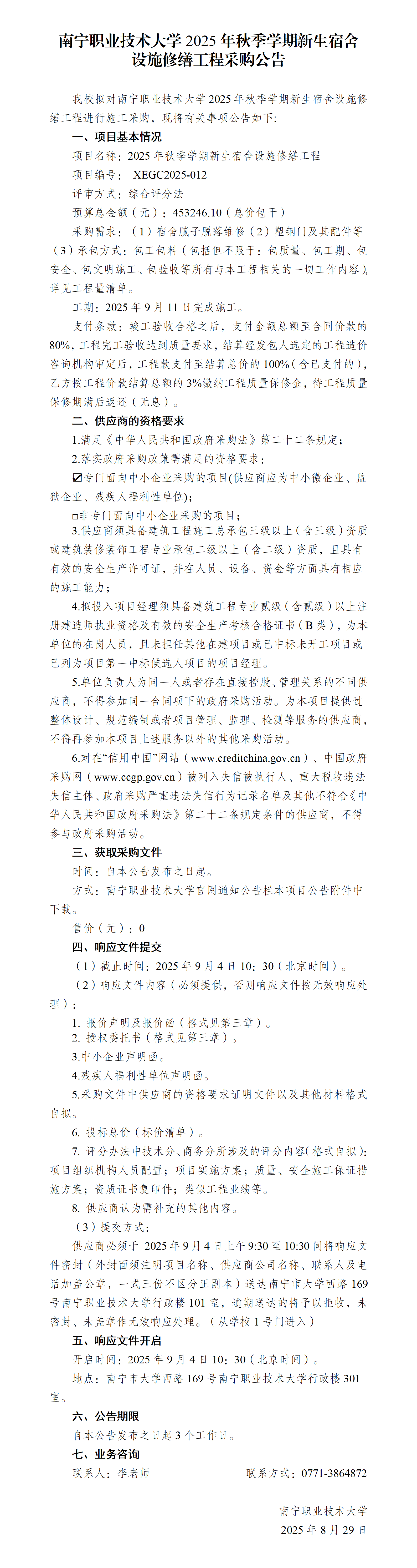 南宁职业技术大学2025年秋季学期新生宿舍设施修缮工程采购公告