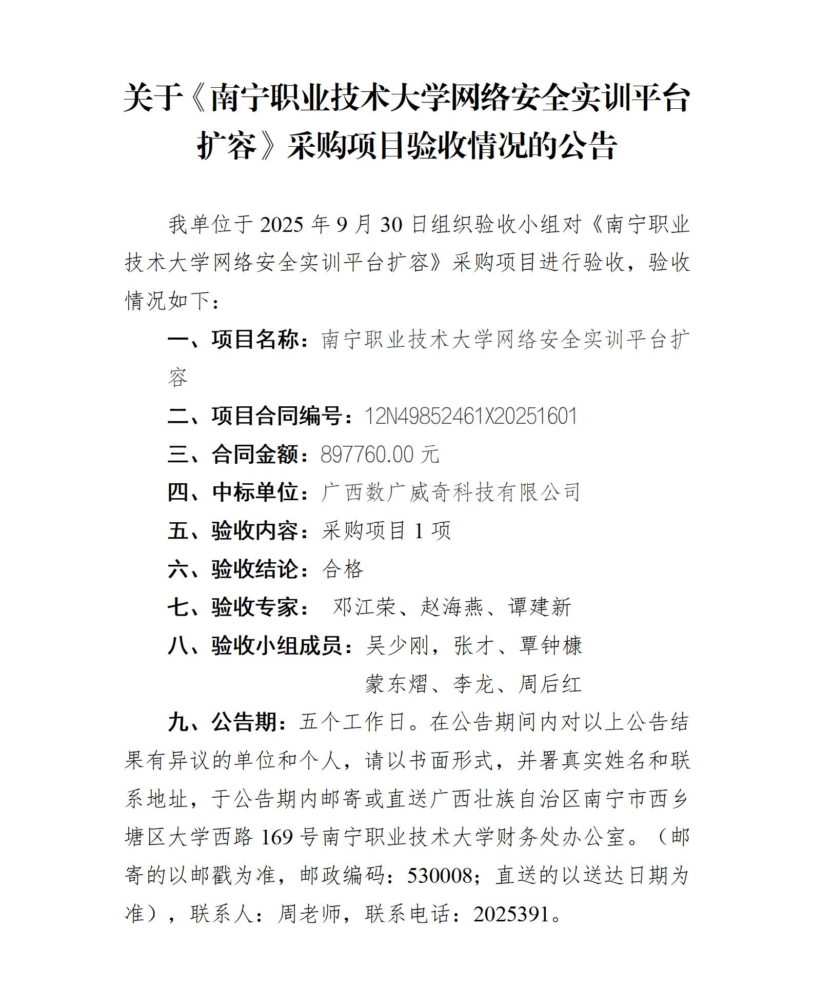 关于《南宁职业技术大学网络安全实训平台扩容》采购项目验收情况的公告