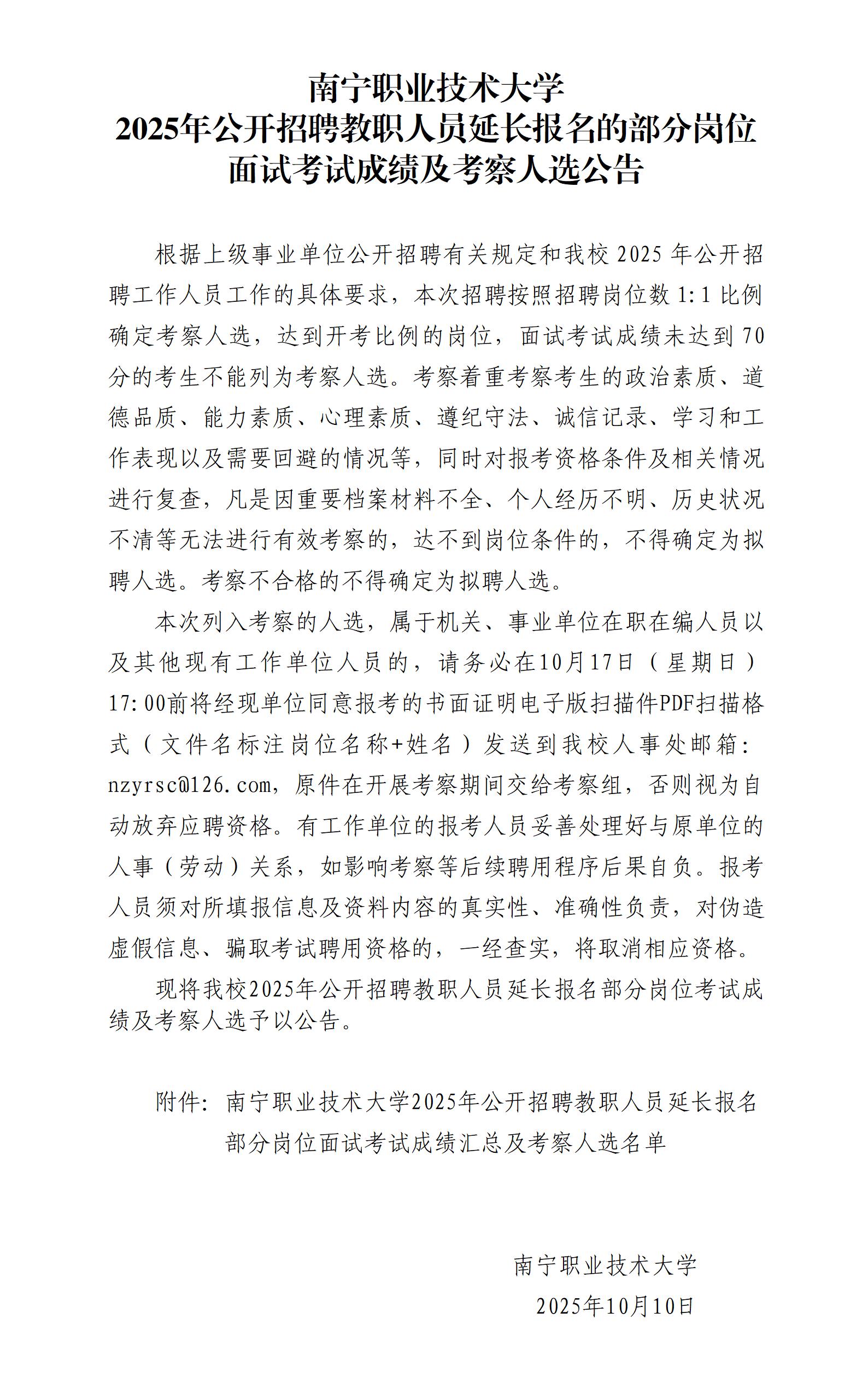 南宁职业技术大学2025年公开招聘教职人员控制数延长报名的部分岗位面试考试成绩及考察人选公告