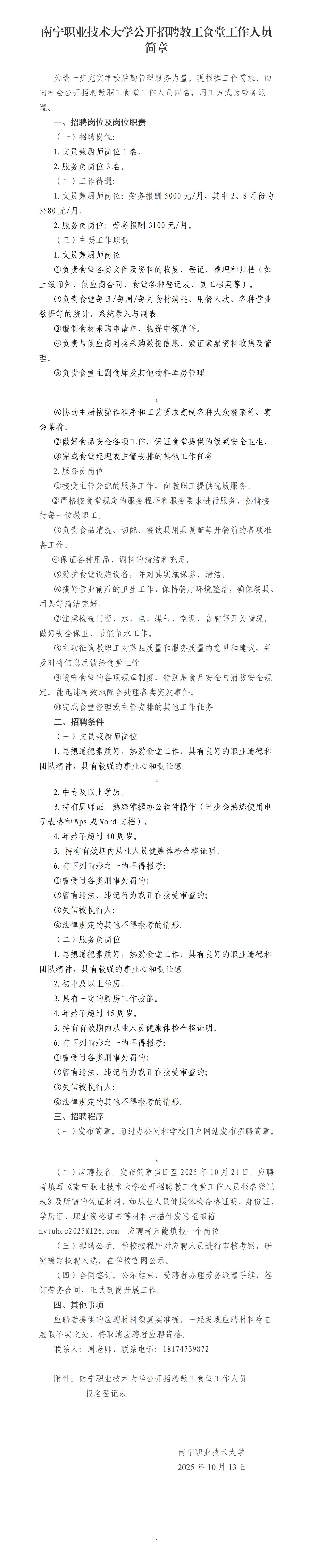 南宁职业技术大学公开招聘教工食堂工作人员简章