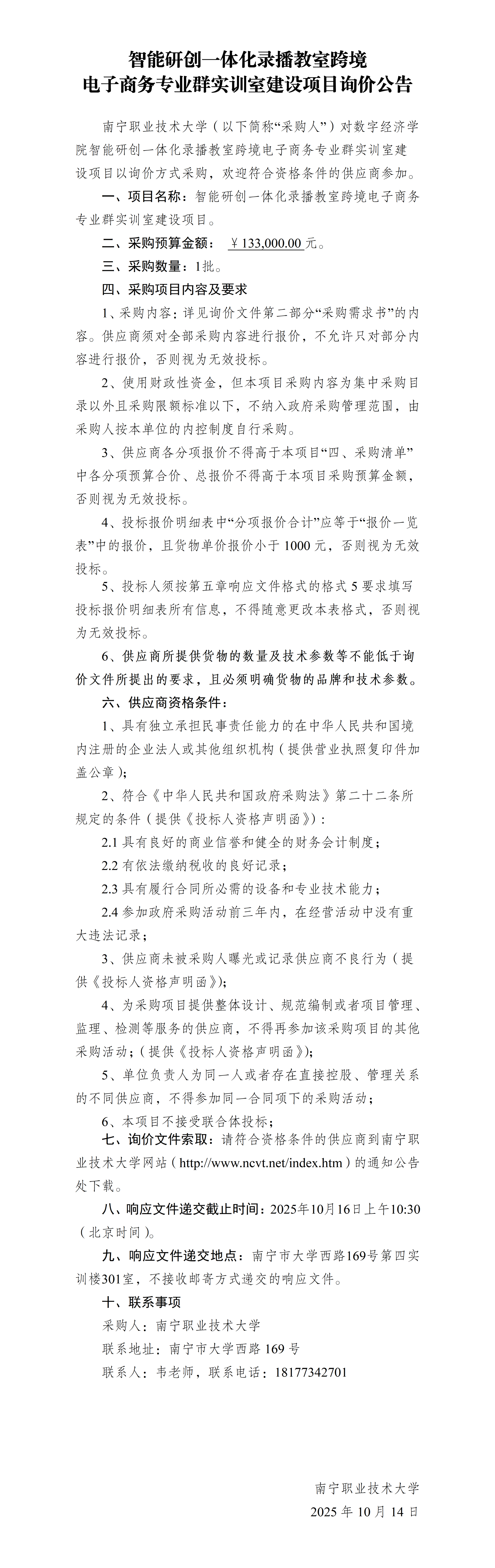 智能研创一体化录播教室跨境电子商务专业群实训室建设项目询价公告