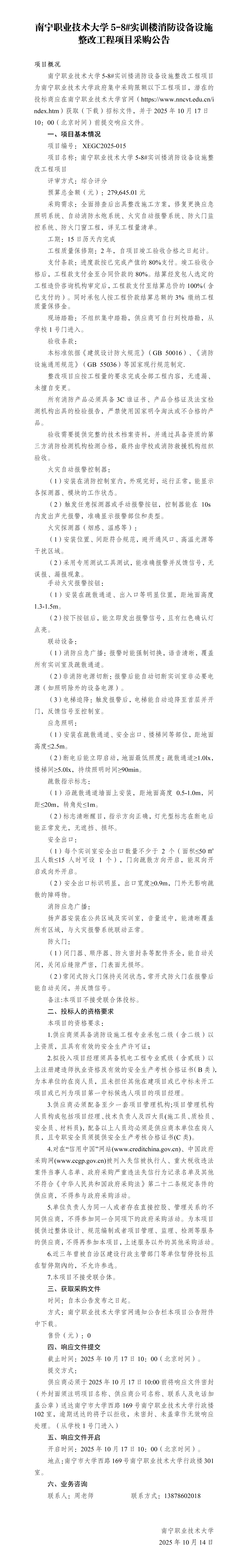 南宁职业技术大学5-8#实训楼消防设备设施整改工程项目采购公告