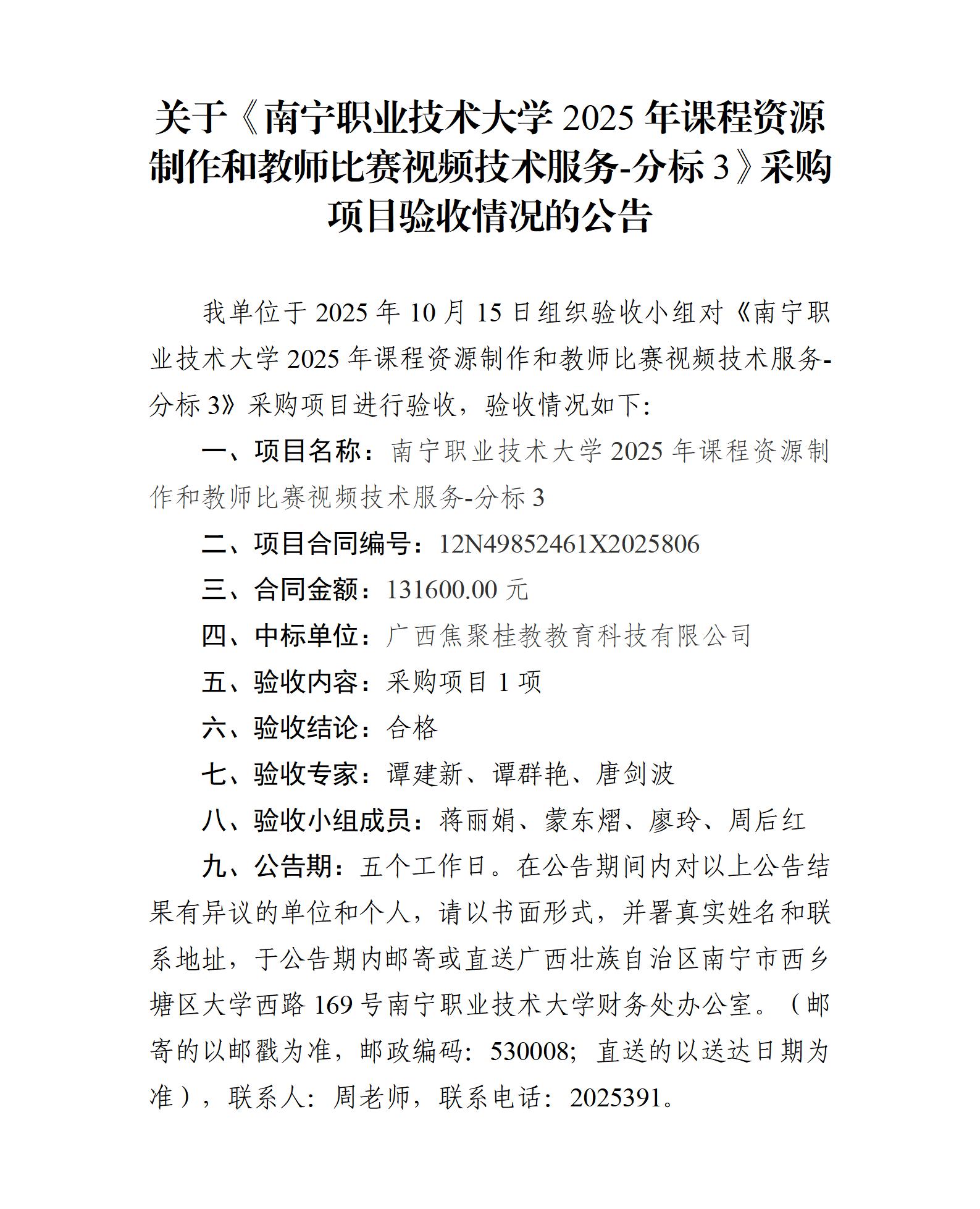 关于《南宁职业技术大学2025年课程资源制作和教师比赛视频技术服务-分标3》采购项目验收情况的公告