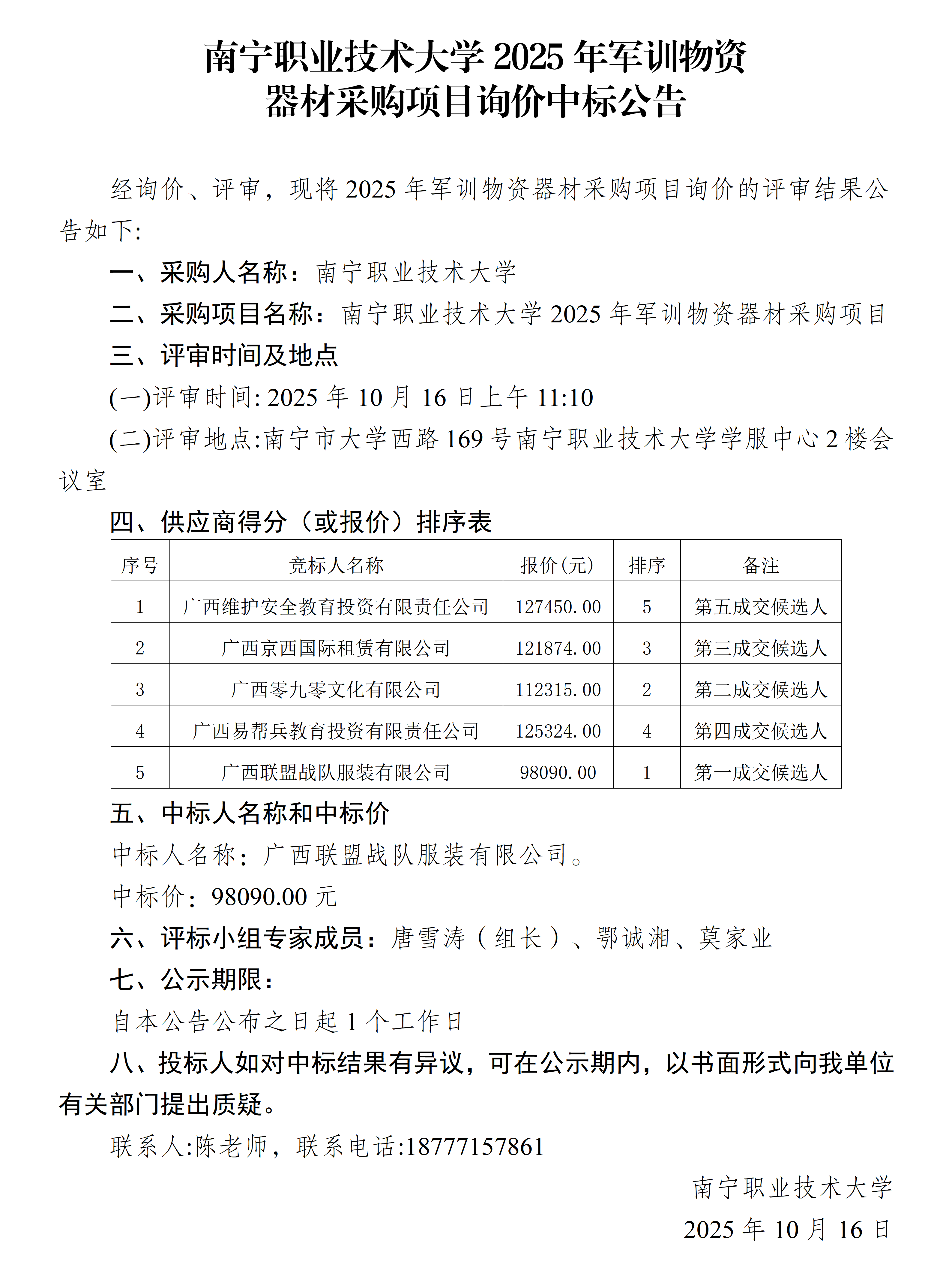 南宁职业技术大学2025年军训物资器材采购项目询价中标公告