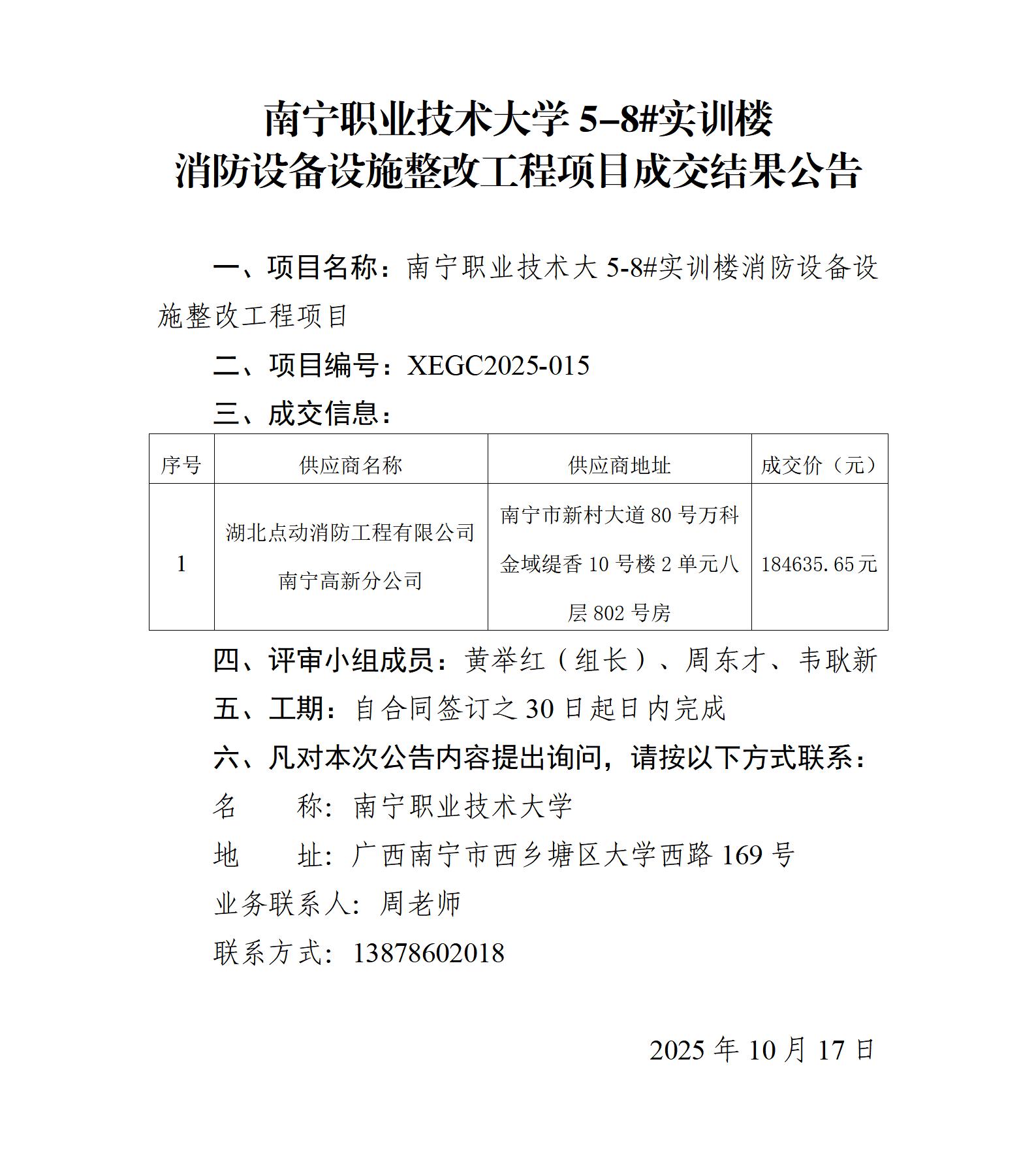 南宁职业技术大学5-8#实训楼 消防设备设施整改工程项目成交结果公告