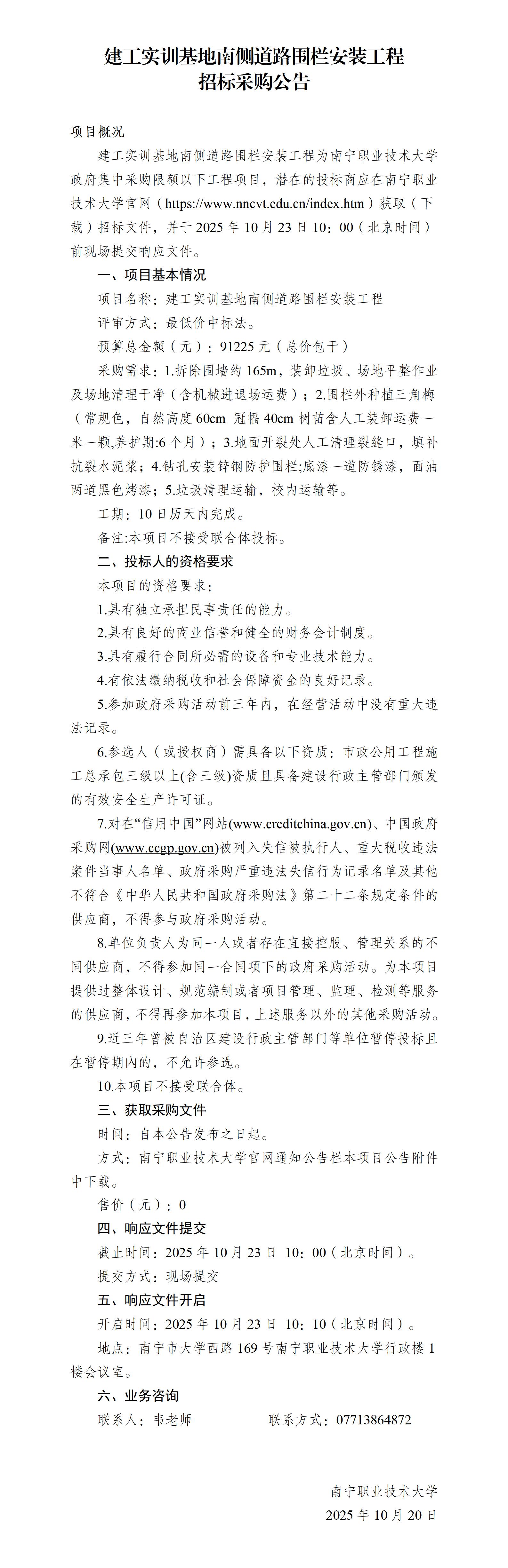建工实训基地南侧道路围栏安装工程招标采购公告