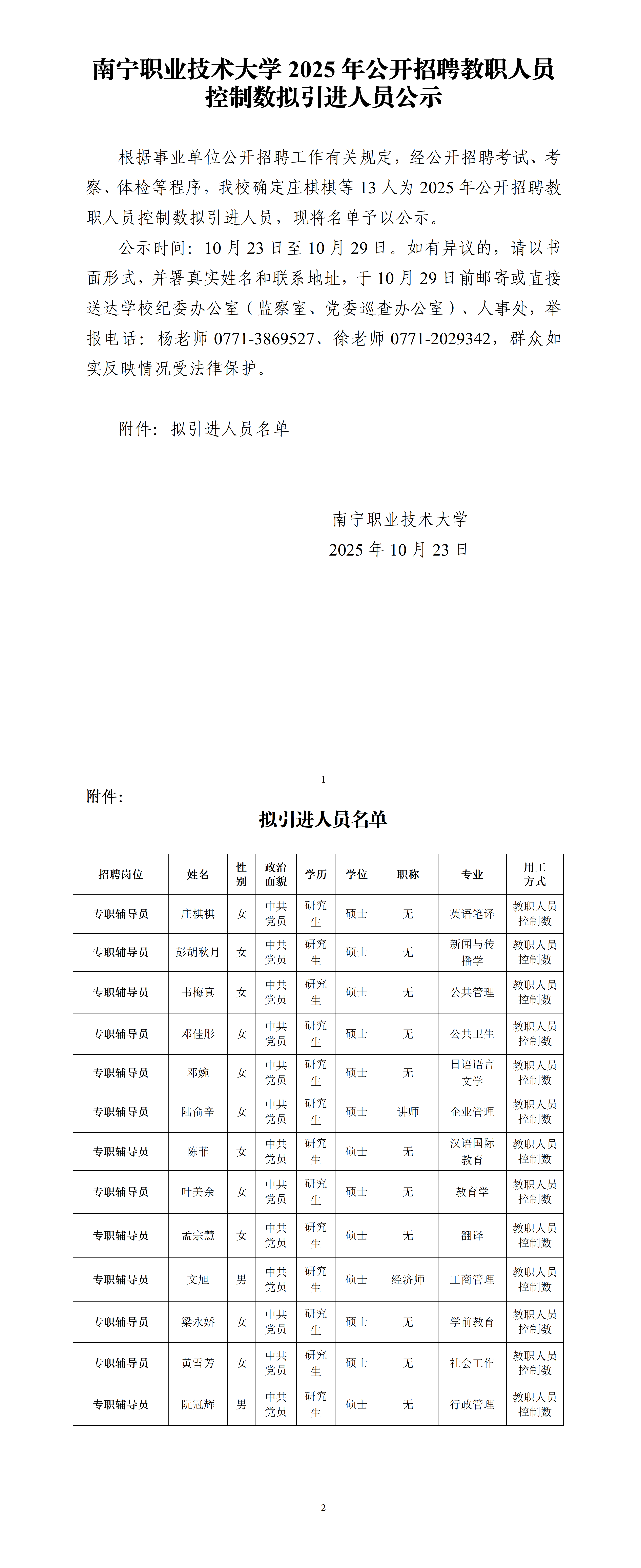 南宁职业技术大学2025年公开招聘教职人员控制数拟引进人员公示