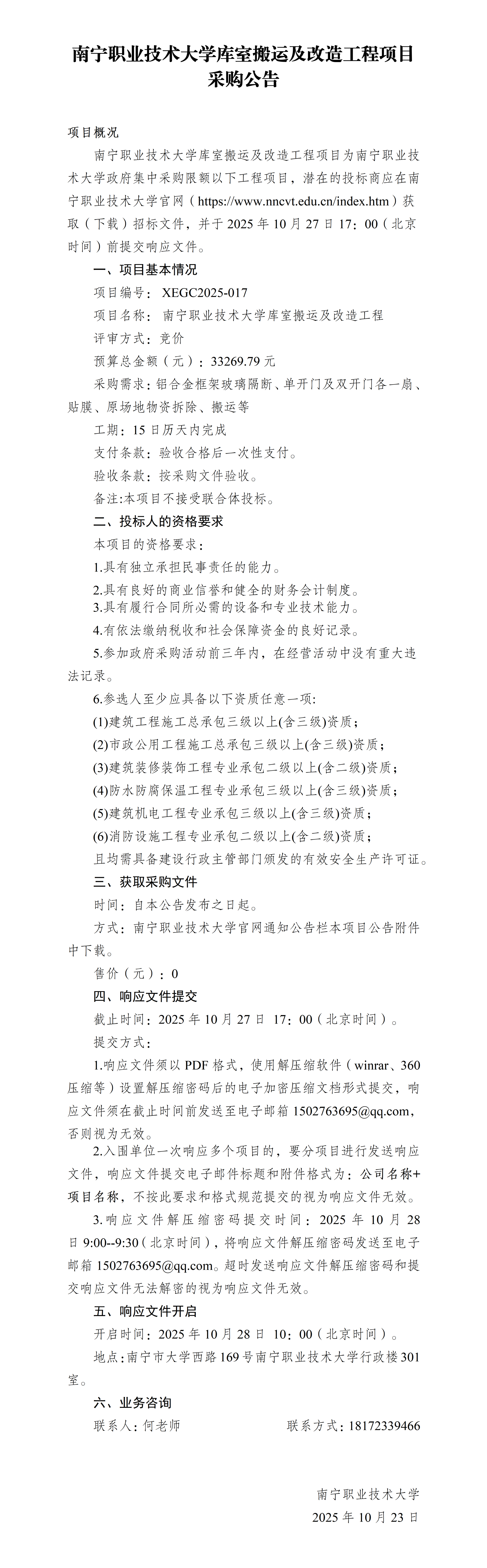 南宁职业技术大学库室搬运及改造工程项目采购公告