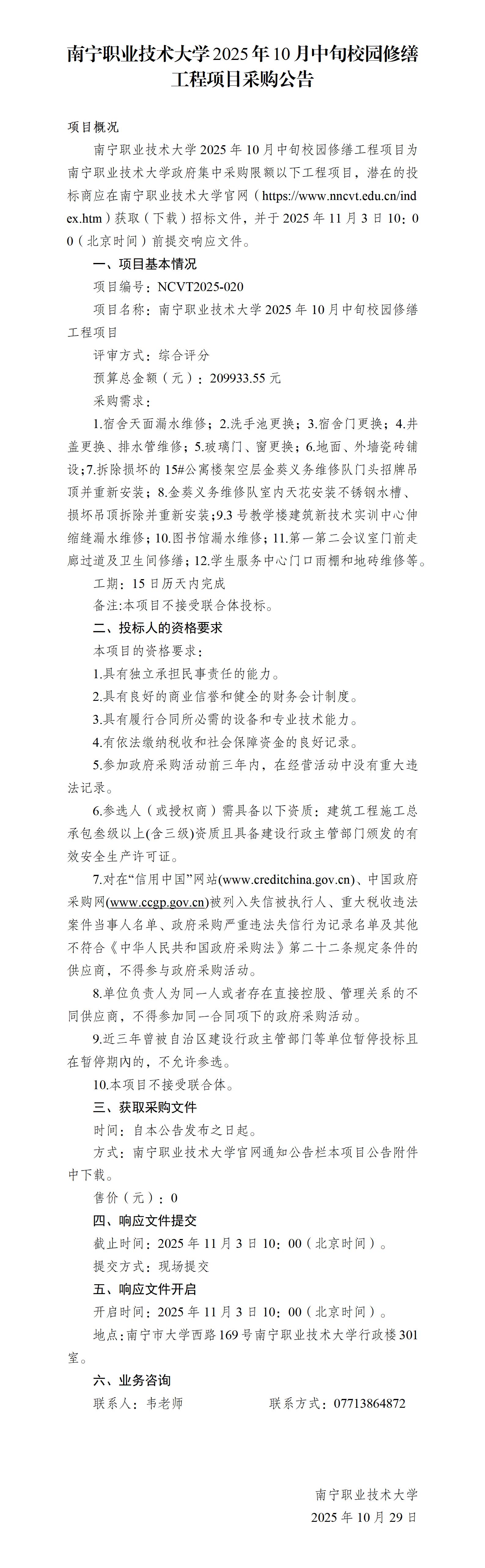 南宁职业技术大学2025年10月中旬校园修缮工程项目采购公告