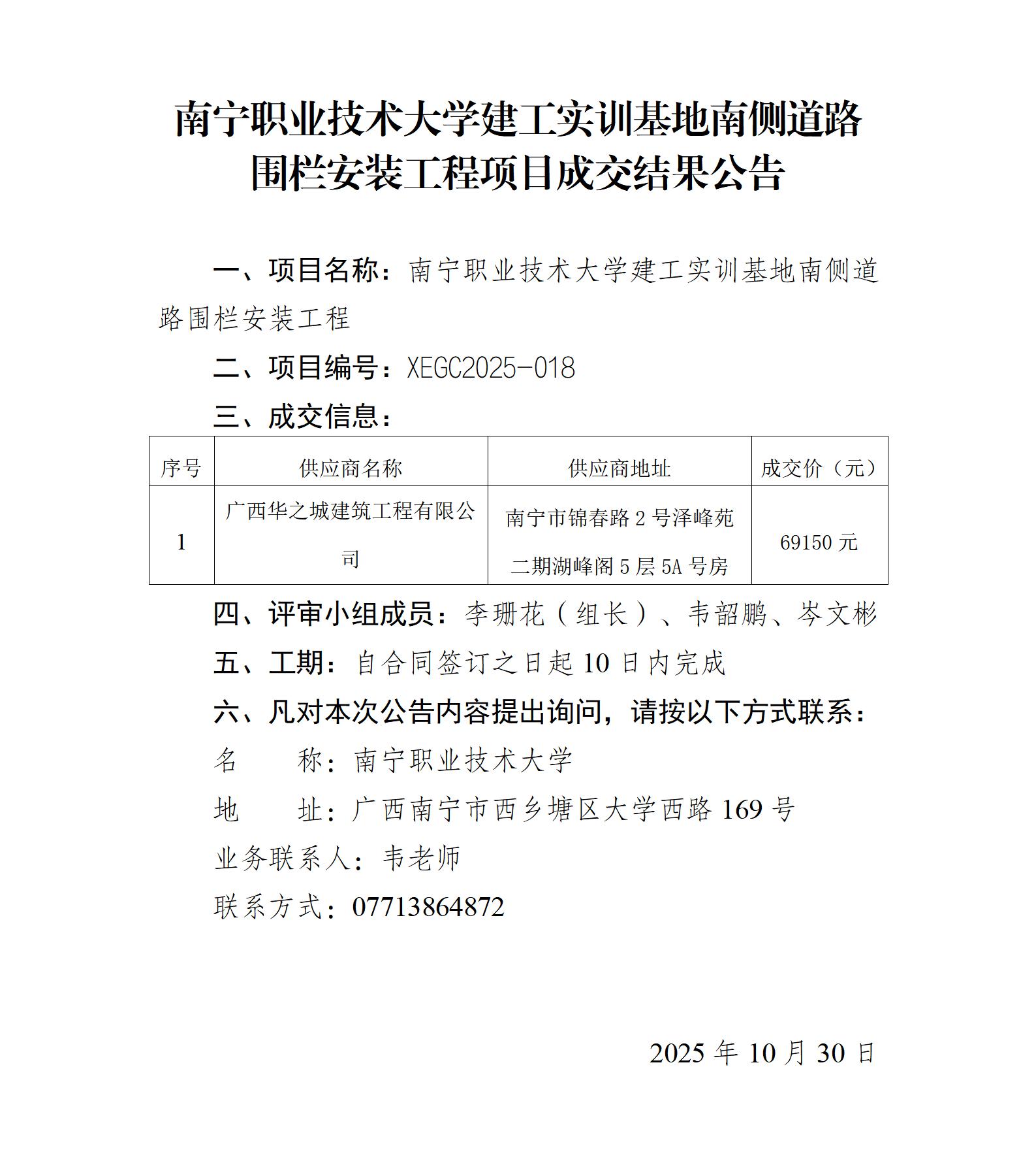 南宁职业技术大学建工实训基地南侧道路围栏安装工程项目成交结果公告