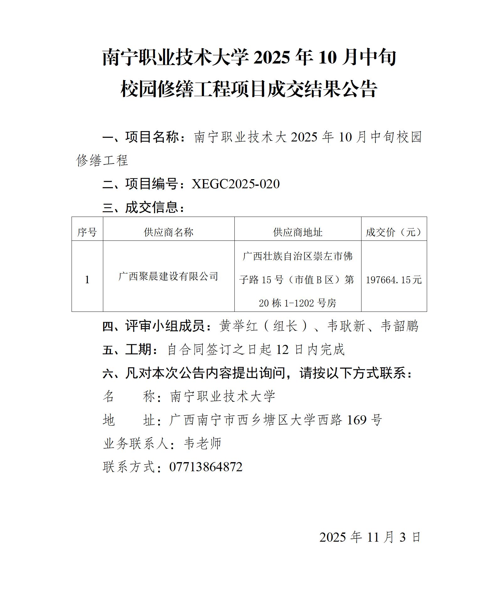 南宁职业技术大学2025年10月中旬校园修缮工程项目成交结果公告