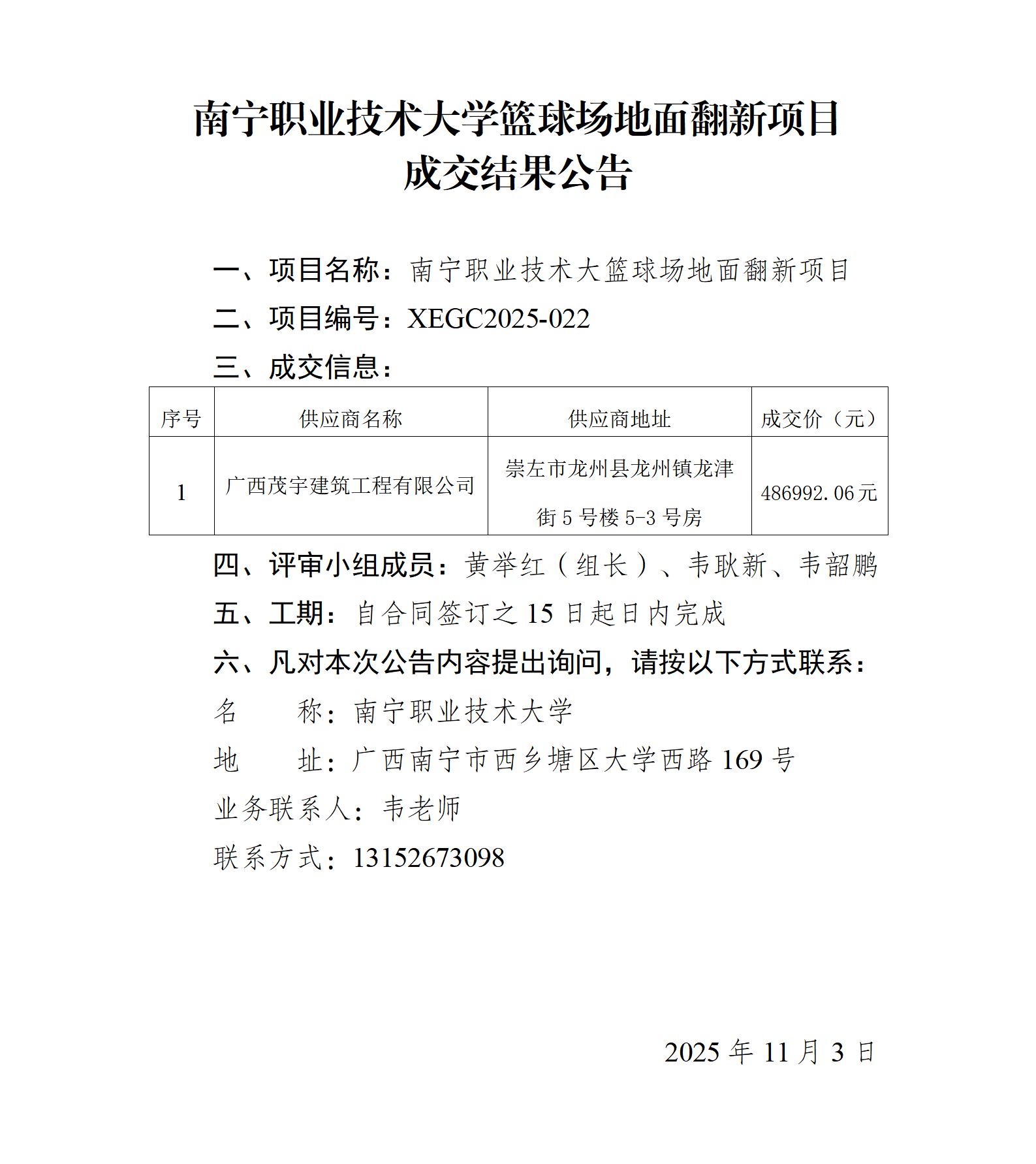 南宁职业技术大学篮球场地面翻新项目成交结果公告