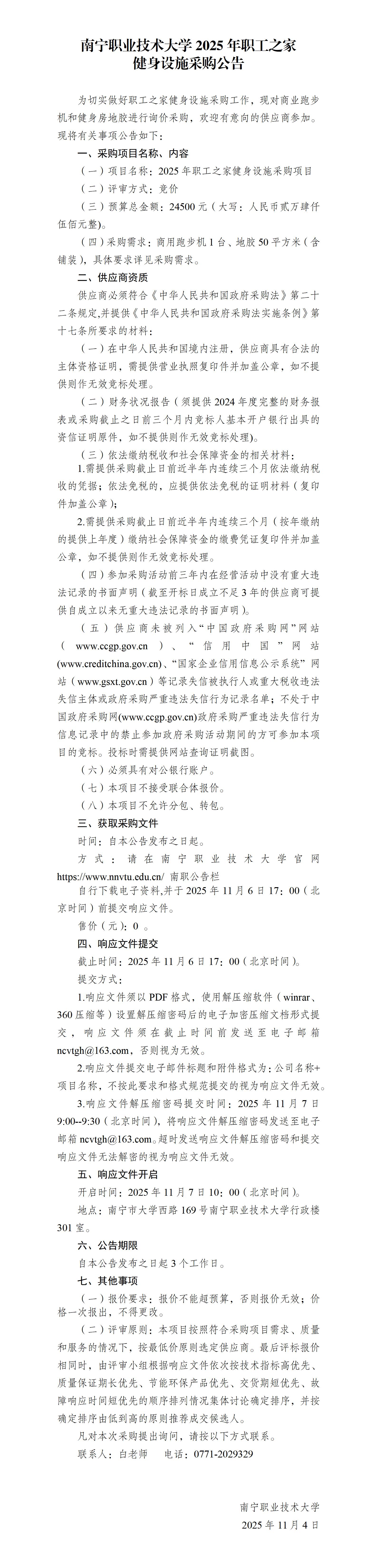 南宁职业技术大学2025年职工之家健身设施采购公告