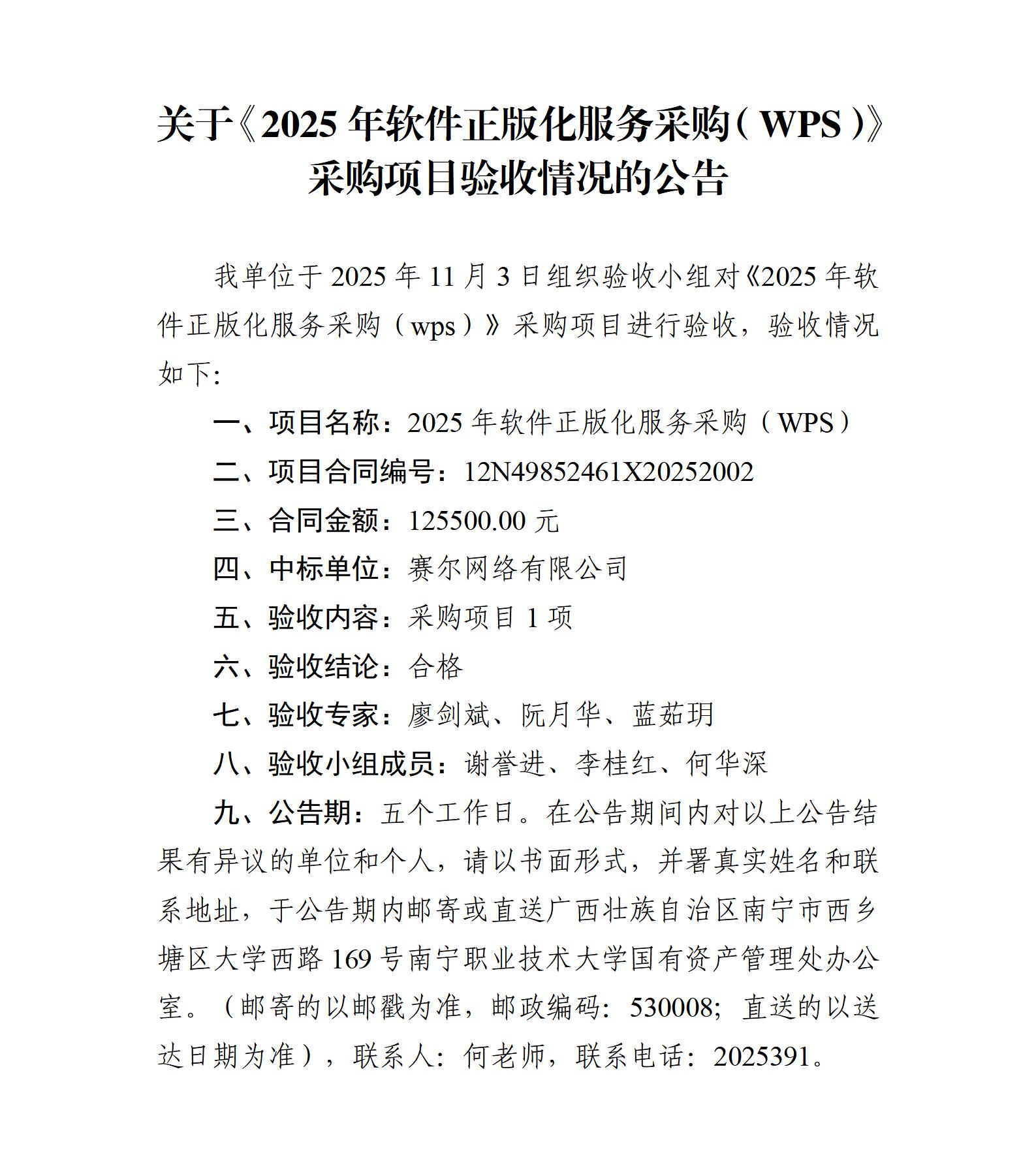 关于《2025年软件正版化服务采购(WPS)》采购项目验收情况的公告
