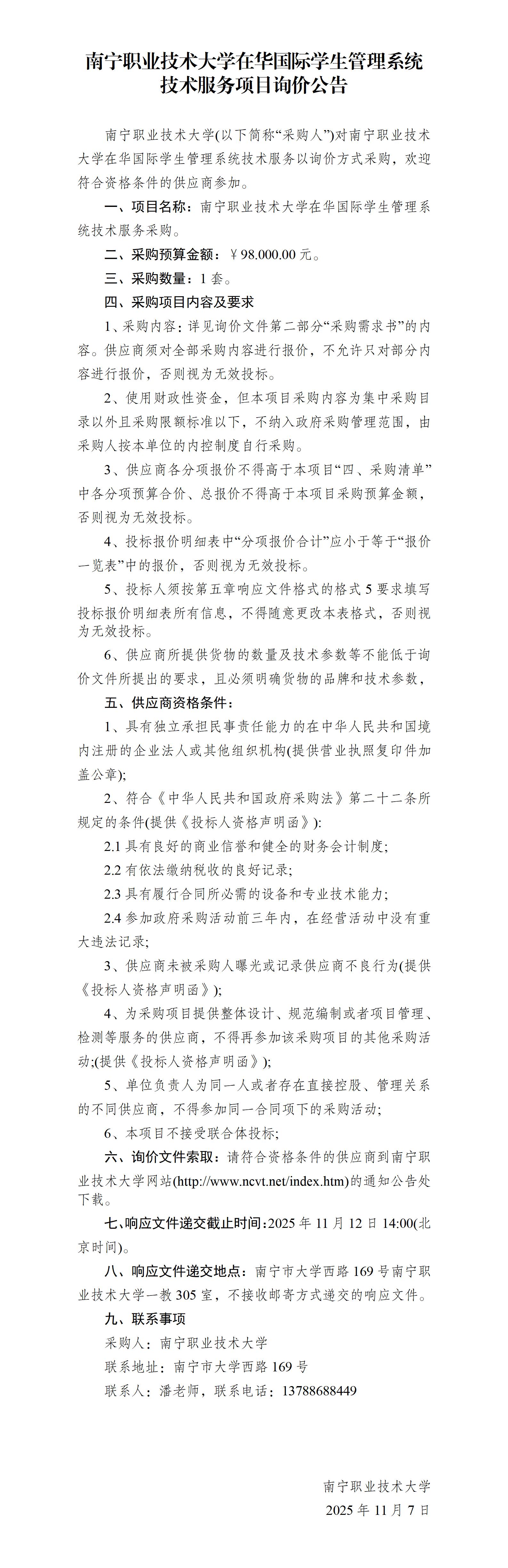南宁职业技术大学在华国际学生管理系统技术服务项目询价公告
