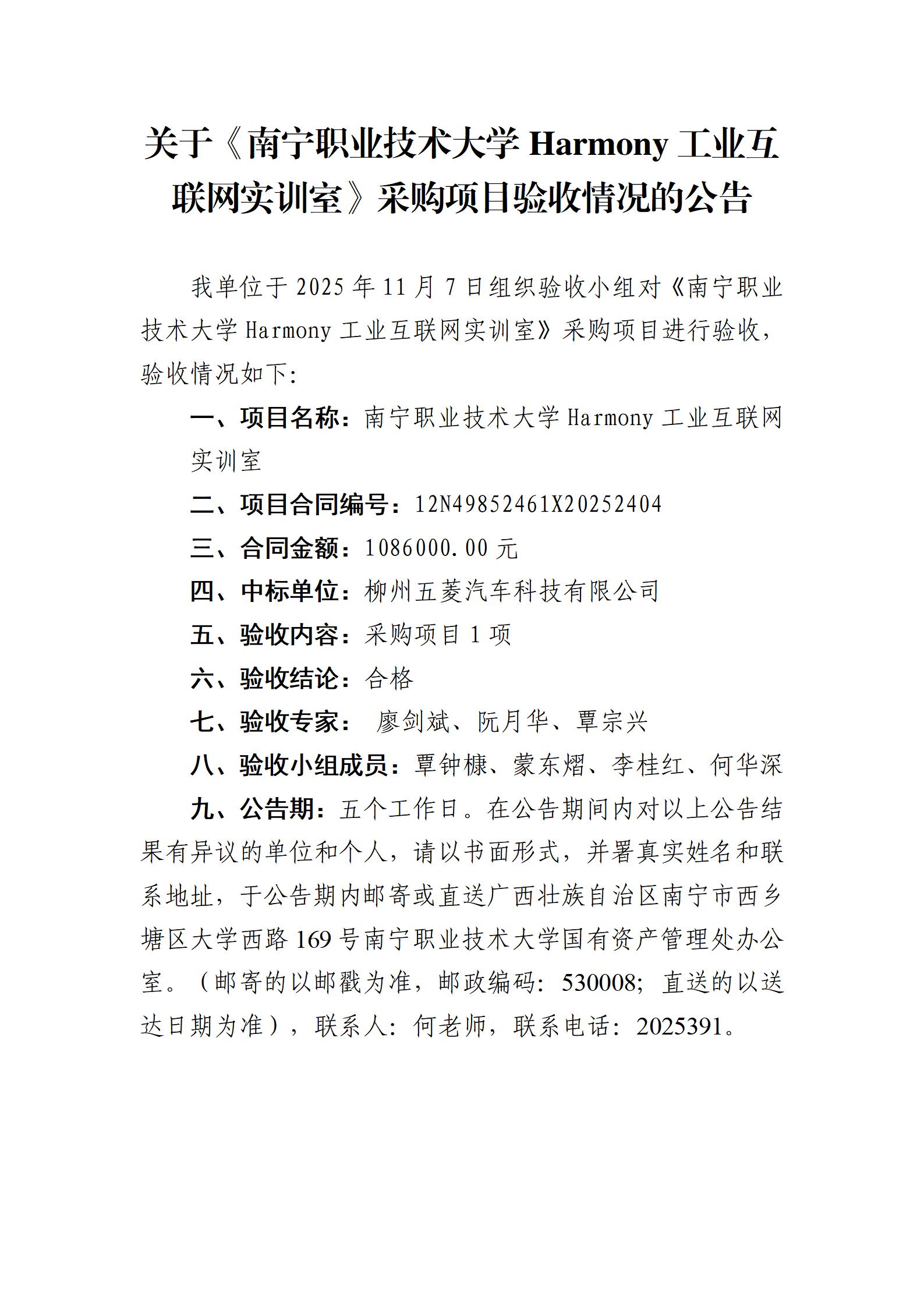 关于《南宁职业技术大学Harmony工业互联网实训室采购》采购项目验收情况的公告