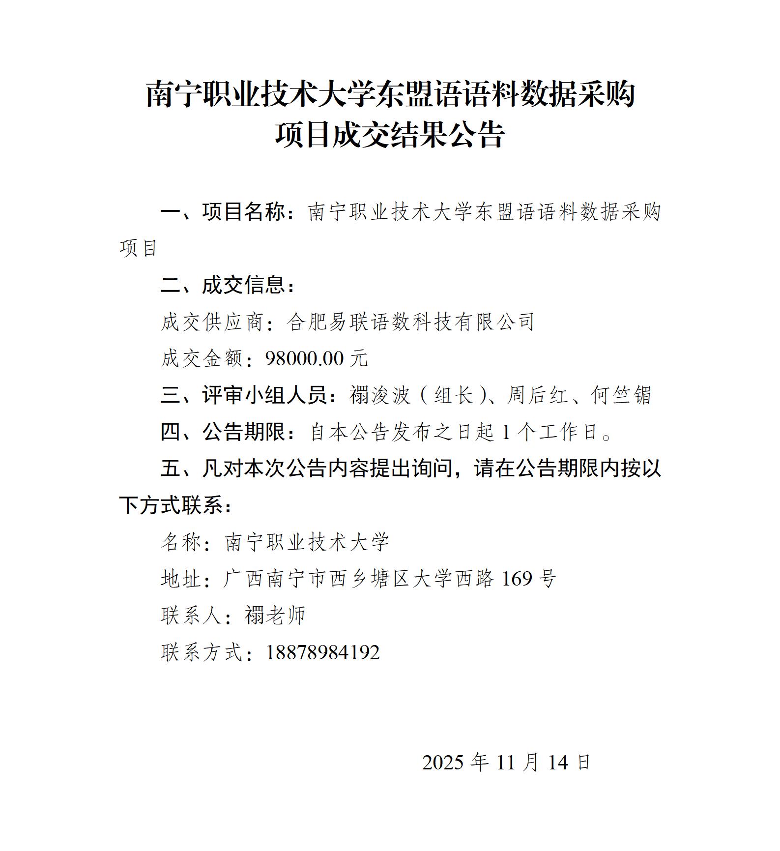 南宁职业技术大学东盟语语料数据采购项目成交结果公告
