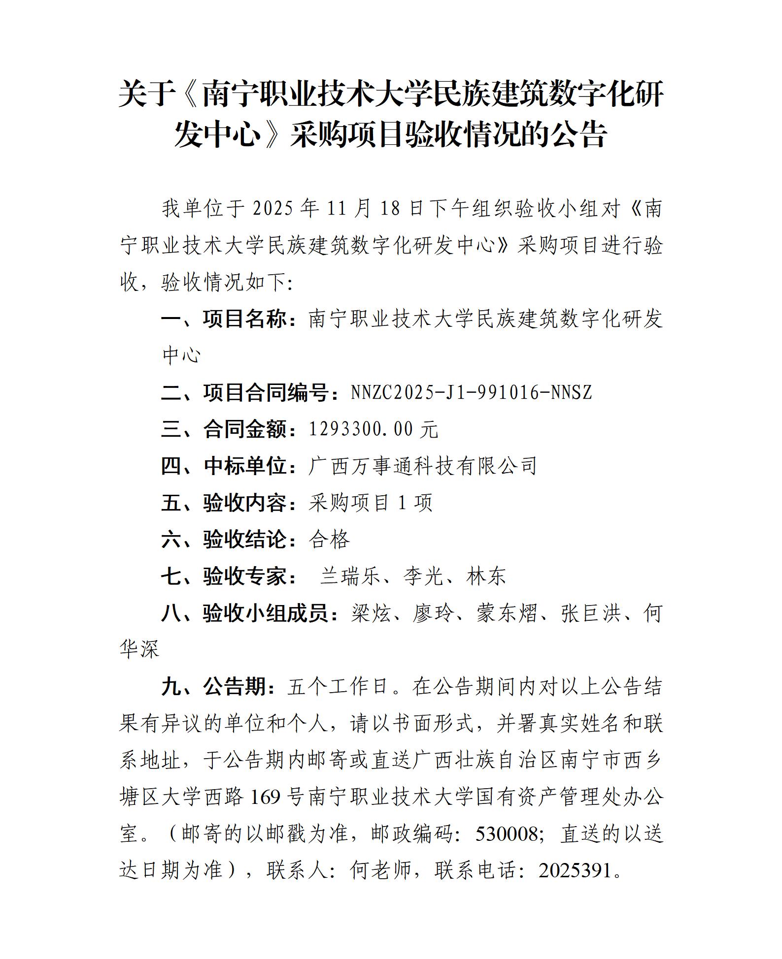 关于《南宁职业技术大学民族建筑数字化研发中心》采购项目验收情况的公告