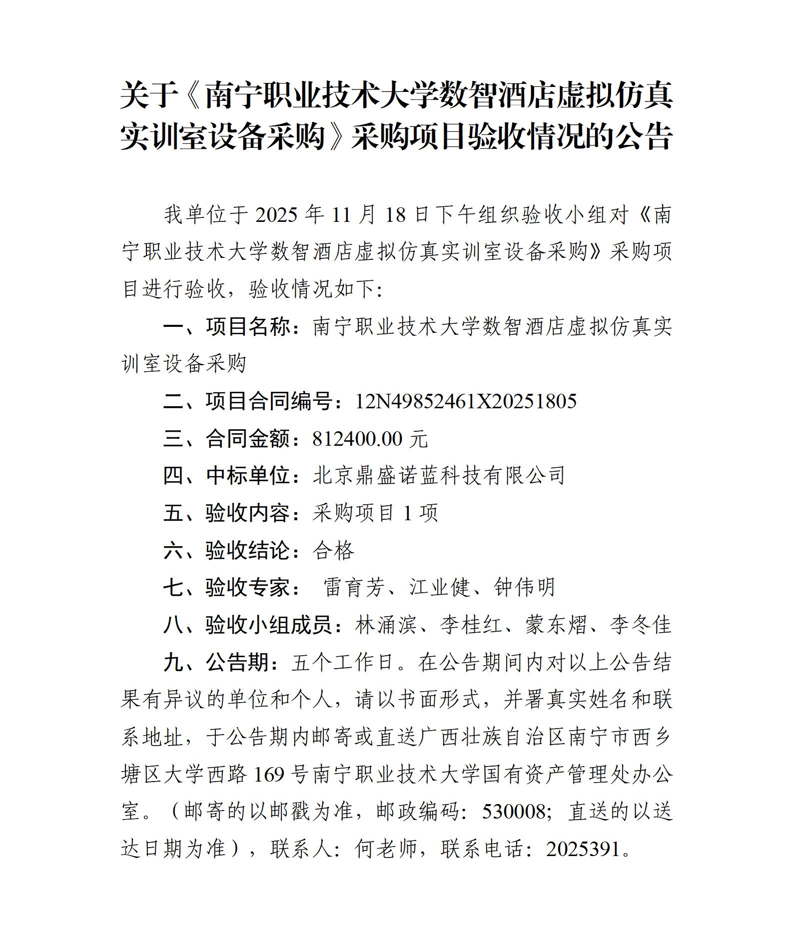 关于《南宁职业技术大学数智酒店虚拟仿真实训室设备采购》采购项目验收情况的公告