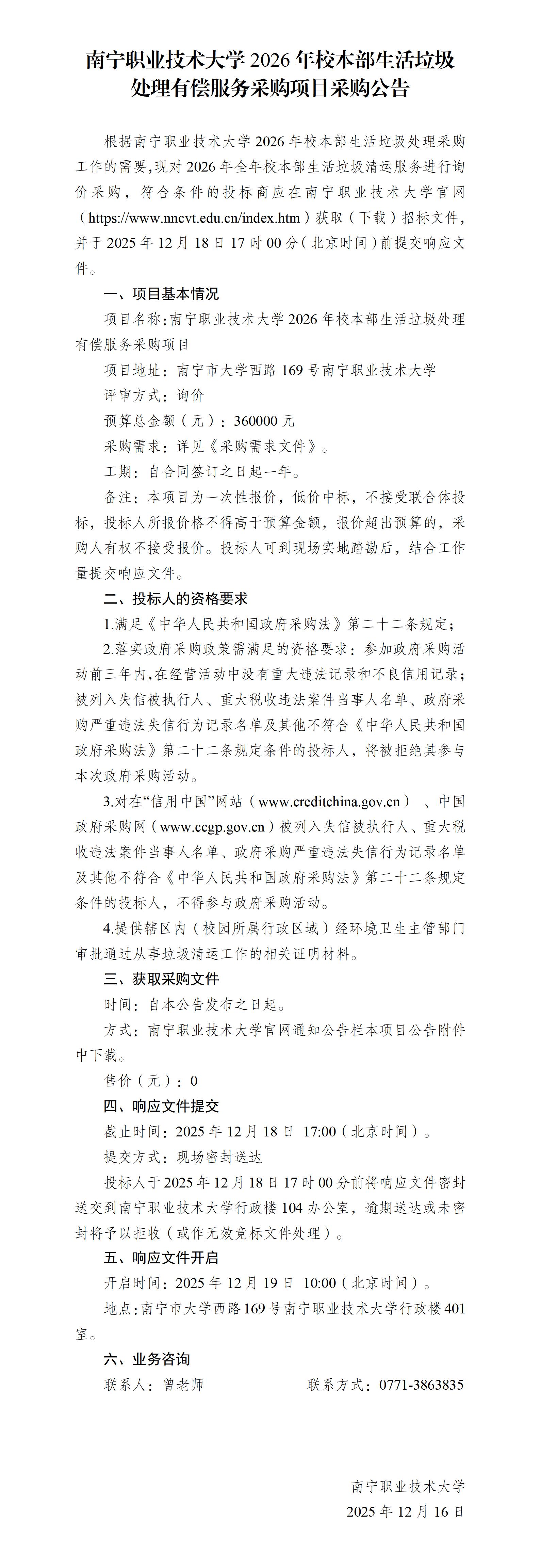 南宁职业技术大学2026年校本部生活垃圾处理有偿服务采购项目采购公告