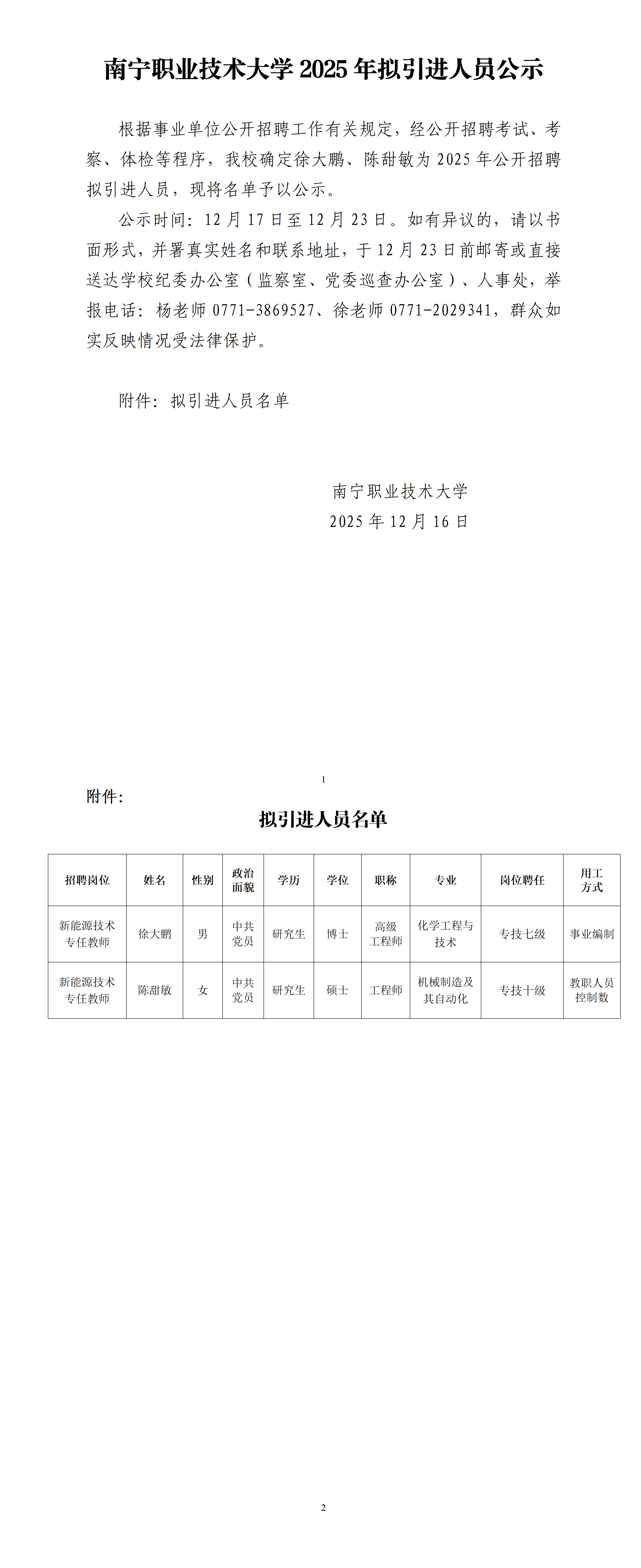 南宁市2025年下半年公开考试招聘事业单位工作人员南宁职业技术大学招聘考察人选公告