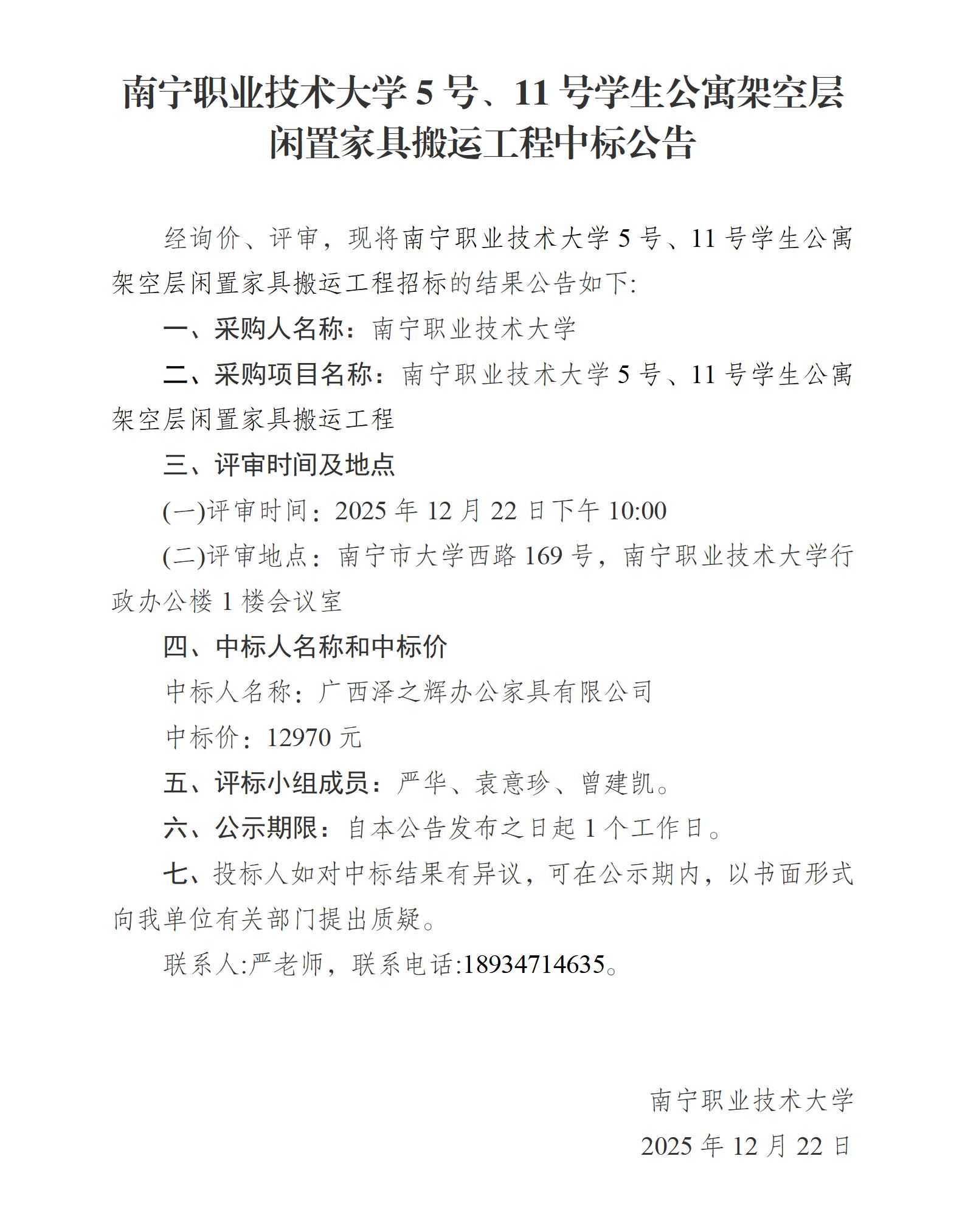 南宁职业技术大学5号、11号学生公寓架空层闲置家具搬运工程中标公告