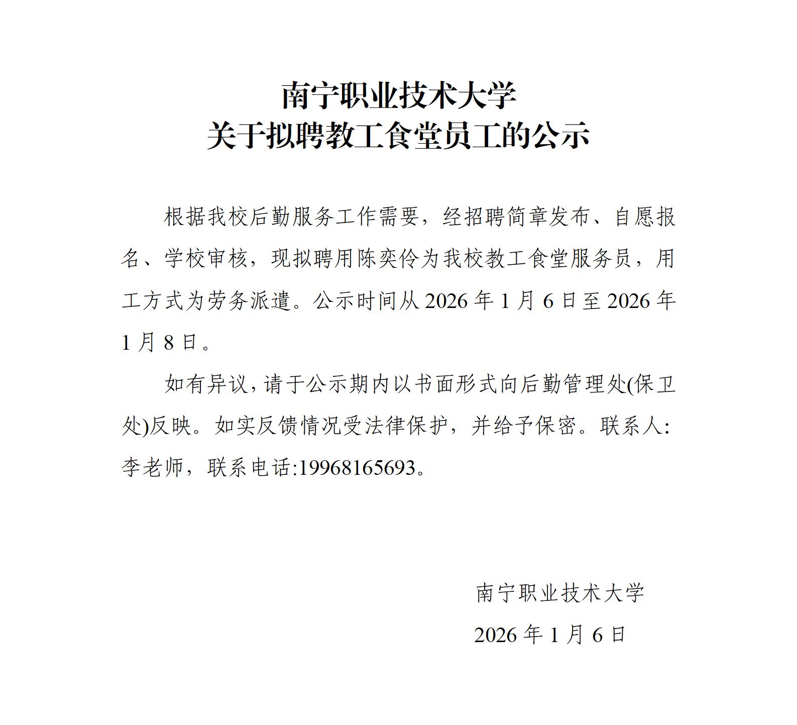 南宁职业技术大学关于拟聘教工食堂员工的公示