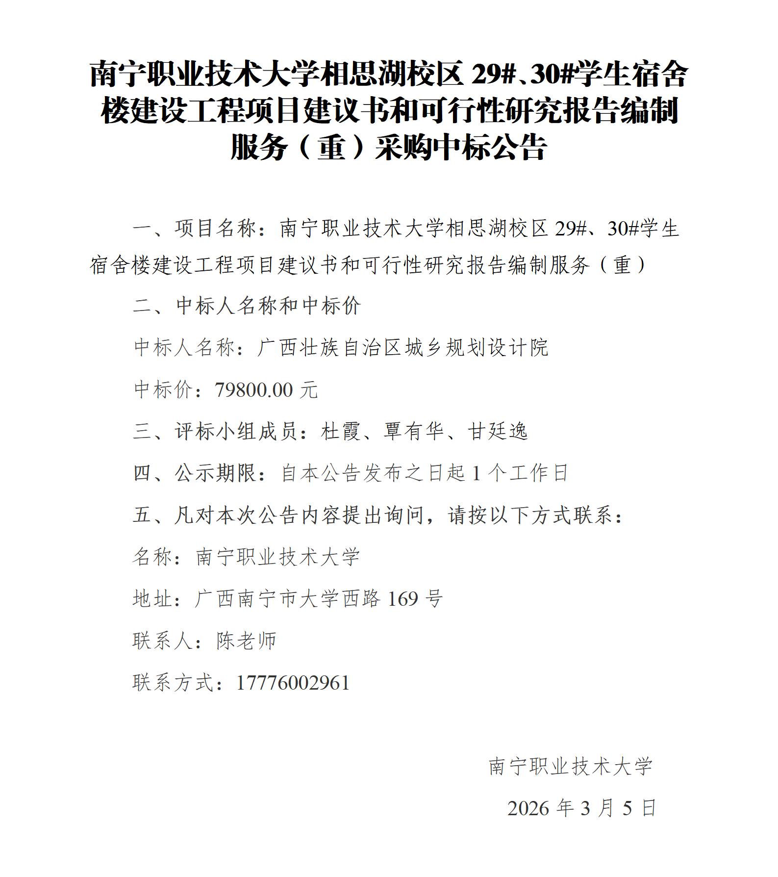 南宁职业技术大学相思湖校区29#、30#学生宿舍楼建设工程项目建议书和可行性研究报告编制服务(重)采购中标公告