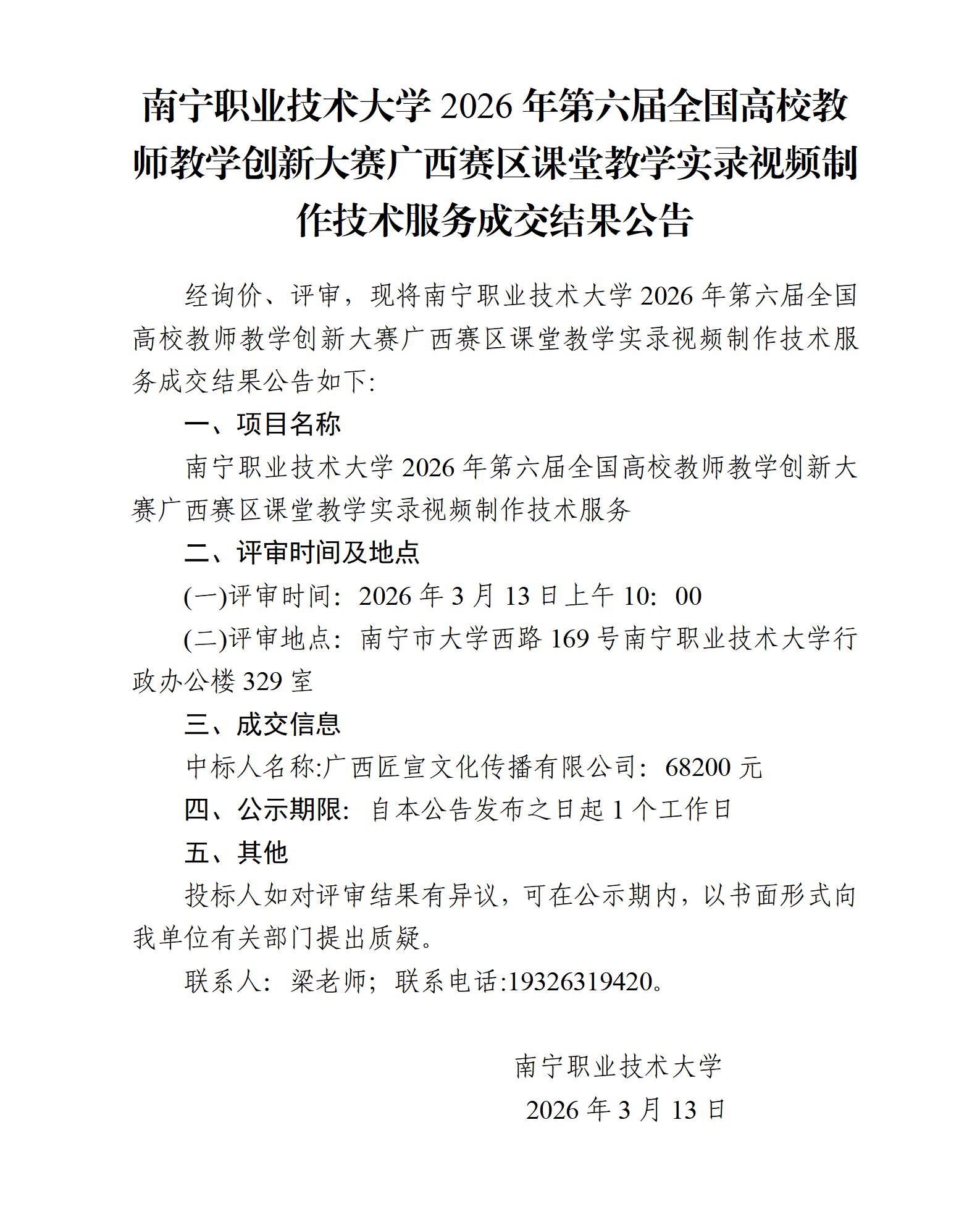 南宁职业技术大学2026年第六届全国高校教师教学创新大赛广西赛区课堂教学实录视频制作技术服务成交结果公告