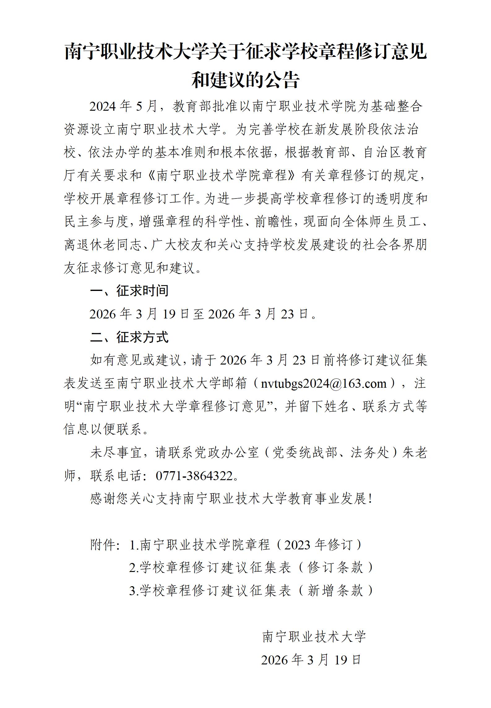 南宁职业技术大学关于征求学校章程修订意见和建议的公告