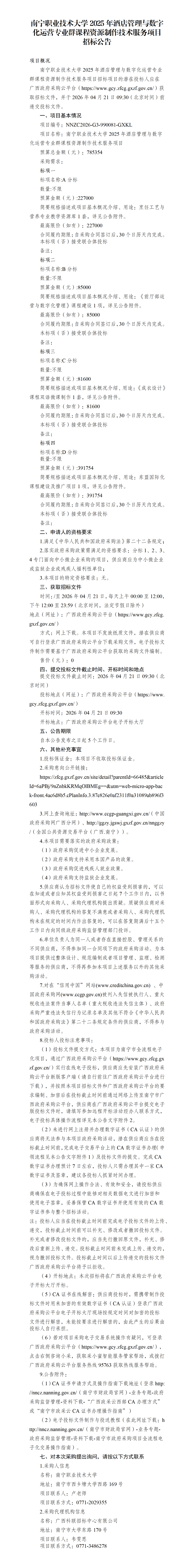 南宁职业技术大学2025年酒店管理与数字化运营专业群课程资源制作技术服务项目 招标公告