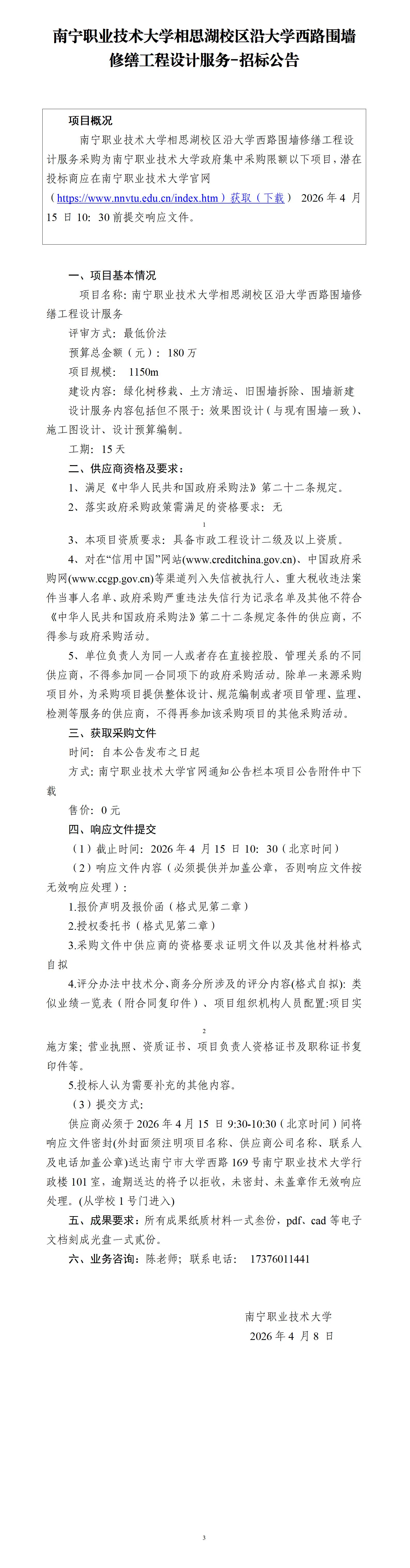 南宁职业技术大学相思湖校区沿大学西路围墙修缮工程设计服务-招标公告