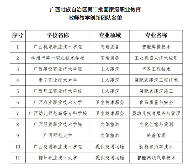 近日,教育部正式公布第二批国家级职业教育教师教学创新团队名单。广西共有11个团队获立项建设并成功入选,覆盖高端装备、土木建筑、卫生健康服务、文体旅游、现代交通运输等多个专业领域。我校装配式建筑工程技术团队荣列其中。此次入选,充分体现了我校在紧密对接区域产业、深化产教融合方面取得的显著成效,也为进一步推进职业教育教学改革、建强高素质“双师型”教师队伍、培养更多高素质技术技能人才与能工巧匠提供了坚实的师资支撑。