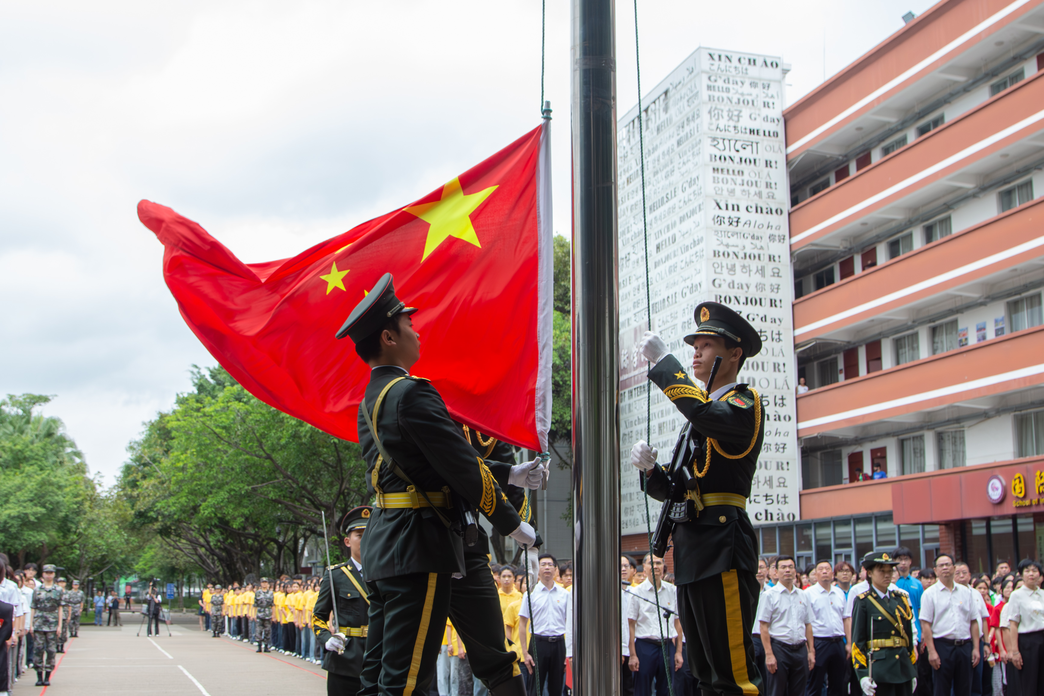 仪式上,在雄壮的《义勇军进行曲》中,鲜艳的五星红旗冉冉升起,全体人员肃立行注目礼,向国旗致以最崇高的敬意。师生们以饱满的姿态高唱国歌,抒发着对祖国的热爱,凝聚起团结奋进的磅礴力量。