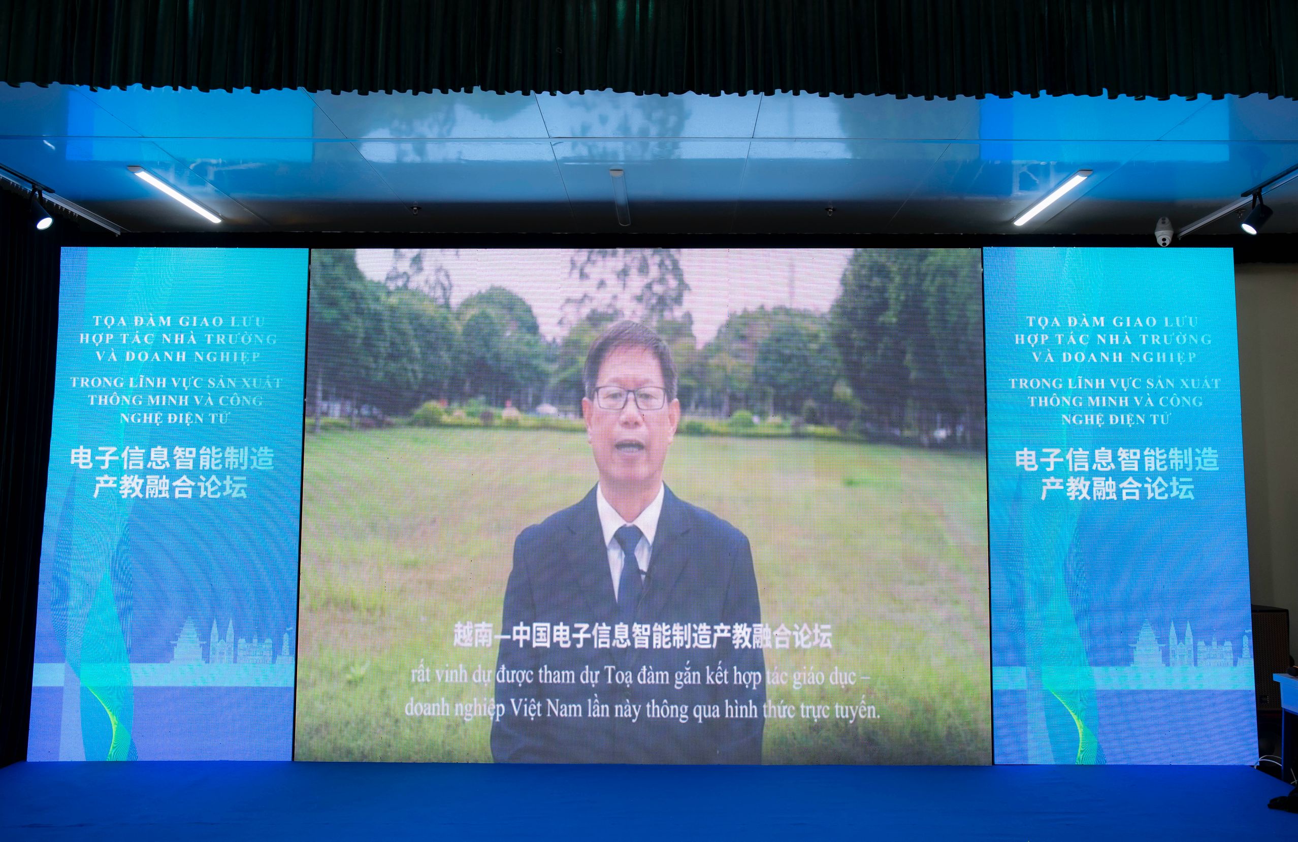 开幕式上,南宁职业技术大学党委副书记、校长周旺通过录制的专题视频致辞,对论坛召开表示祝贺。他指出,中越职业教育合作潜力巨大、前景广阔,期待双方围绕“深化产教融合、共育高素质工匠人才”目标,进一步拓展智能制造与职业教育领域的务实合作,为区域产业升级与经济高质量注入“职教动能”。