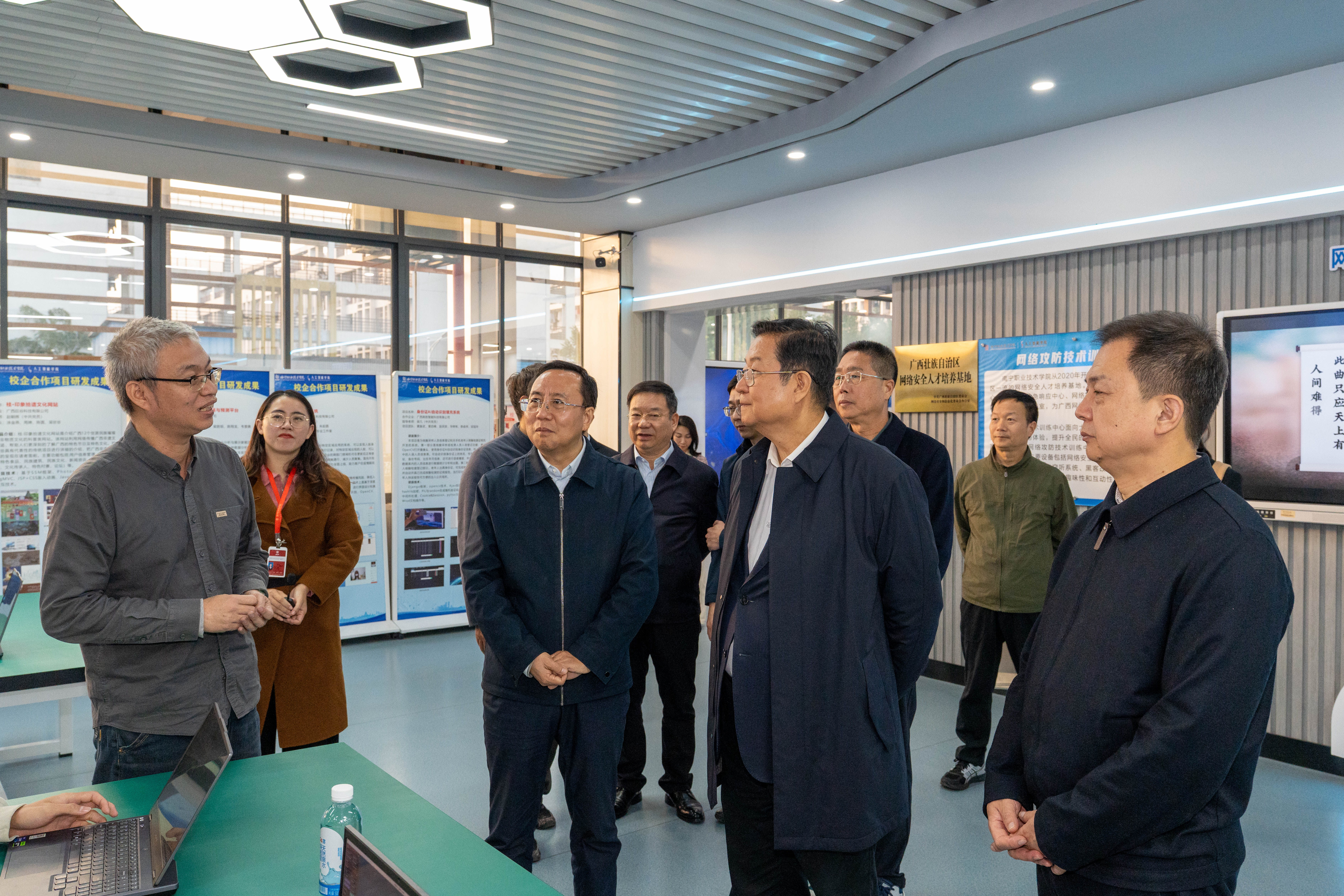 在智能工程学院,刘利民一行走进先进制造技术实践基地,重点调研中国—越南电子信息现代工匠学院,了解其办学模式、工作特色以及建设成效,并走进在越中资龙头企业订单班与越南学籍留学生深入交流。在人工智能学院,刘利民一行走进新一代信息技术协同创新中心及成果展示厅,了解中国—东盟职教云平台建设、国际化教材开发成果、华为ICT产业学院、具身机器人研发与应用,以及该学院与马来西亚合作项目情况。在数字经济学院,刘利民一行参观了国际化办学展厅、中国—东盟跨境电商大数据协同创新中心,了解中国—东盟教育开放合作试验区来桂留学基地、广西国际友城职业教育联盟、桂港现代职业教育发展中心、学校海外办学点以及学校面向东盟开展技术技能培训和人文交流情况,以及了解中国—东盟跨境电商大数据协同创新中心与东盟各国共建共享人才培养标准、跨境电商实时数据、跨境直播平台等有关情况。
