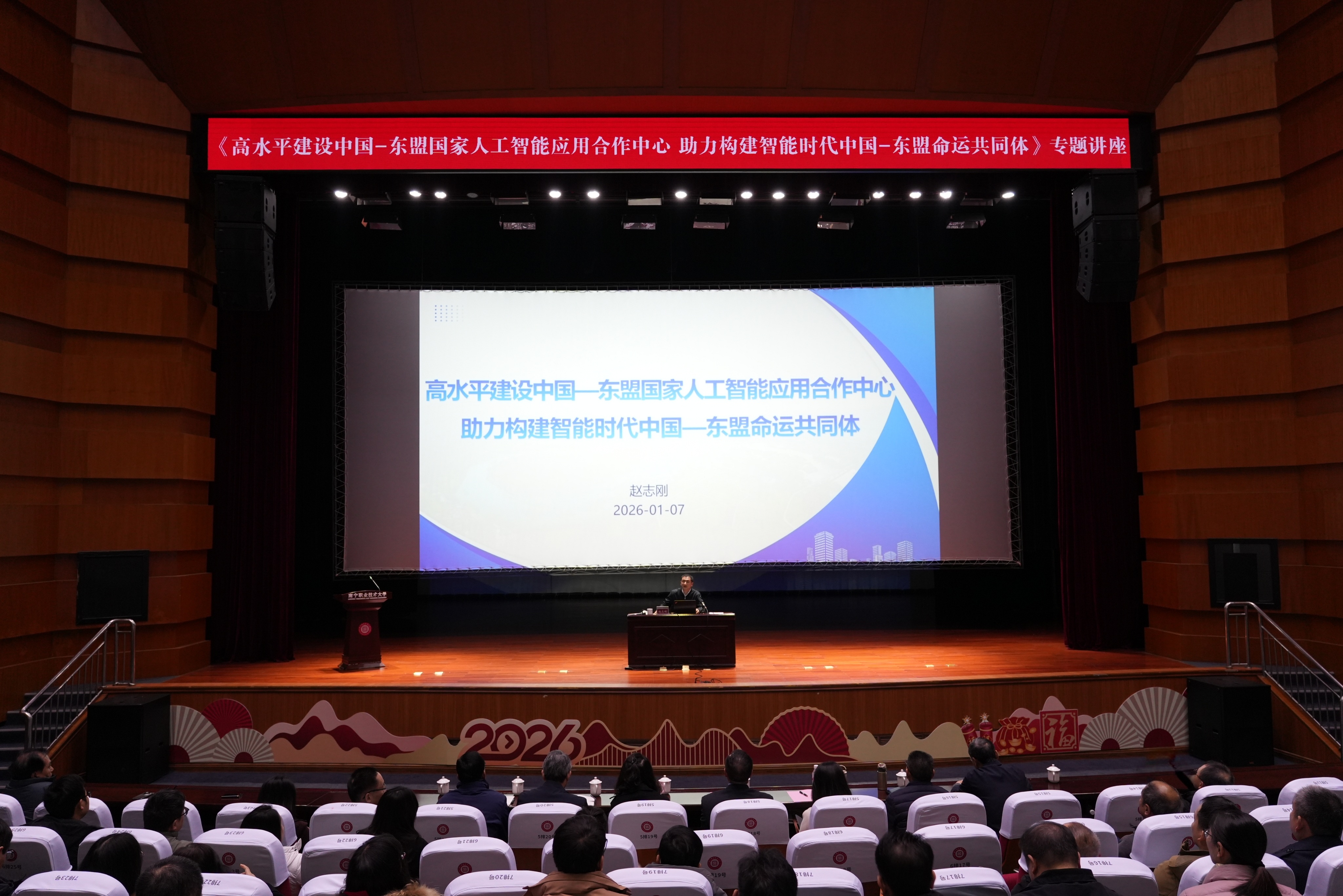 1月7日,广西壮族自治区人民政府副秘书长,广西壮族自治区大数据发展局党组书记、局长,中国—东盟信息港建设办公室主任,广西壮族自治区政务服务监督管理办公室主任赵志刚受邀到我校作题为“高水平建设中国—东盟国家人工智能应用合作中心 助力构建智能时代中国—东盟命运共同体”的专题讲座。讲座由学校党委书记蹇兴超主持。