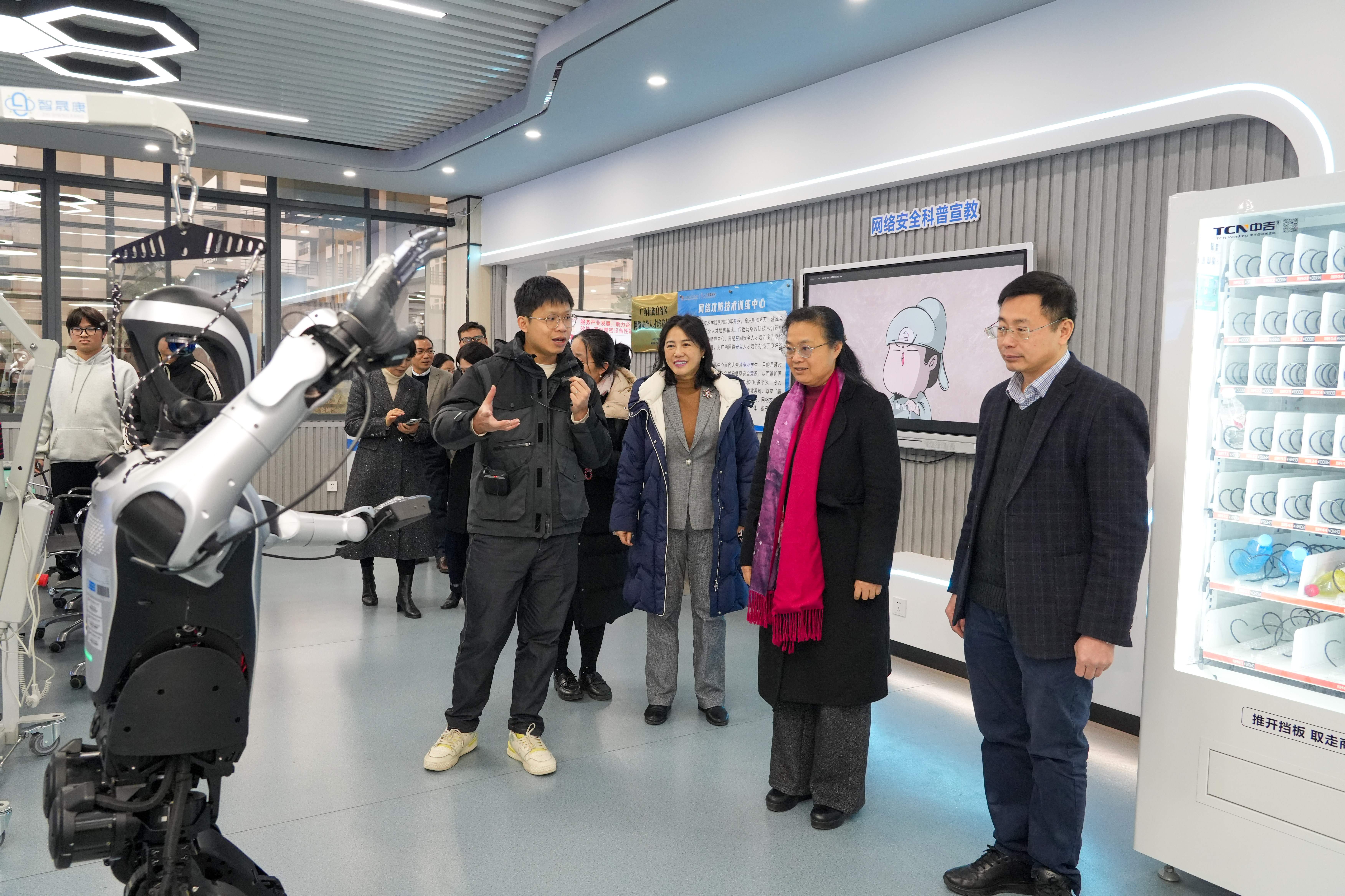 会后,韦仕珍一行在宾月景的陪同下,参观了学校智能工程学院先进制造技术实践基地、人工智能学院新一代信息技术协同创新中心、智慧城市学院民族建筑博物馆、数字经济学院中国—东盟跨境电商大数据协同创新中心和国际化展厅、艺术与传媒学院等多个校内场馆。