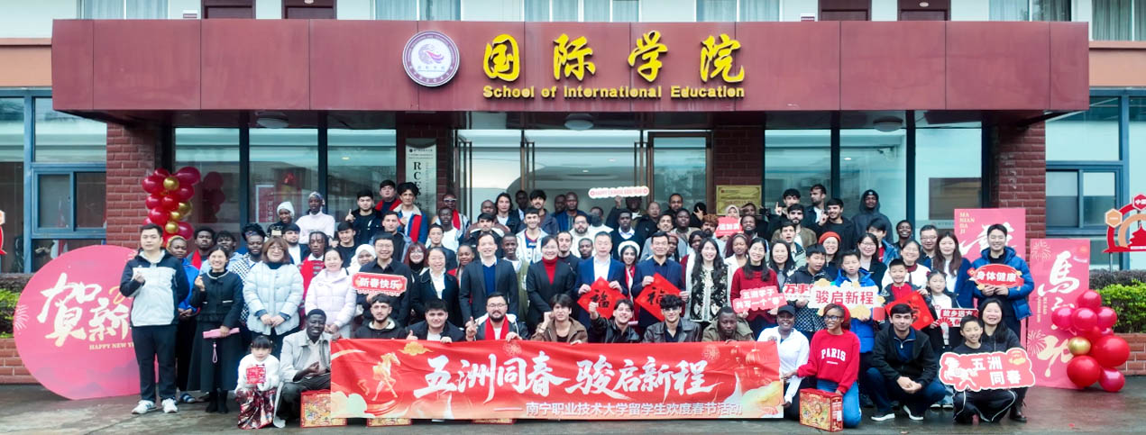 2月12日,2026年“五洲同春 骏启新程”南宁职业技术大学留学生欢度春节活动在国际学院举行。学校党委副书记、校长宾月景,党委常委、副校长李东升,国际交流与合作处、国际学院相关领导以及师生代表与全体留校留学生欢聚一堂,共同迎接即将到来的2026年马年新春。