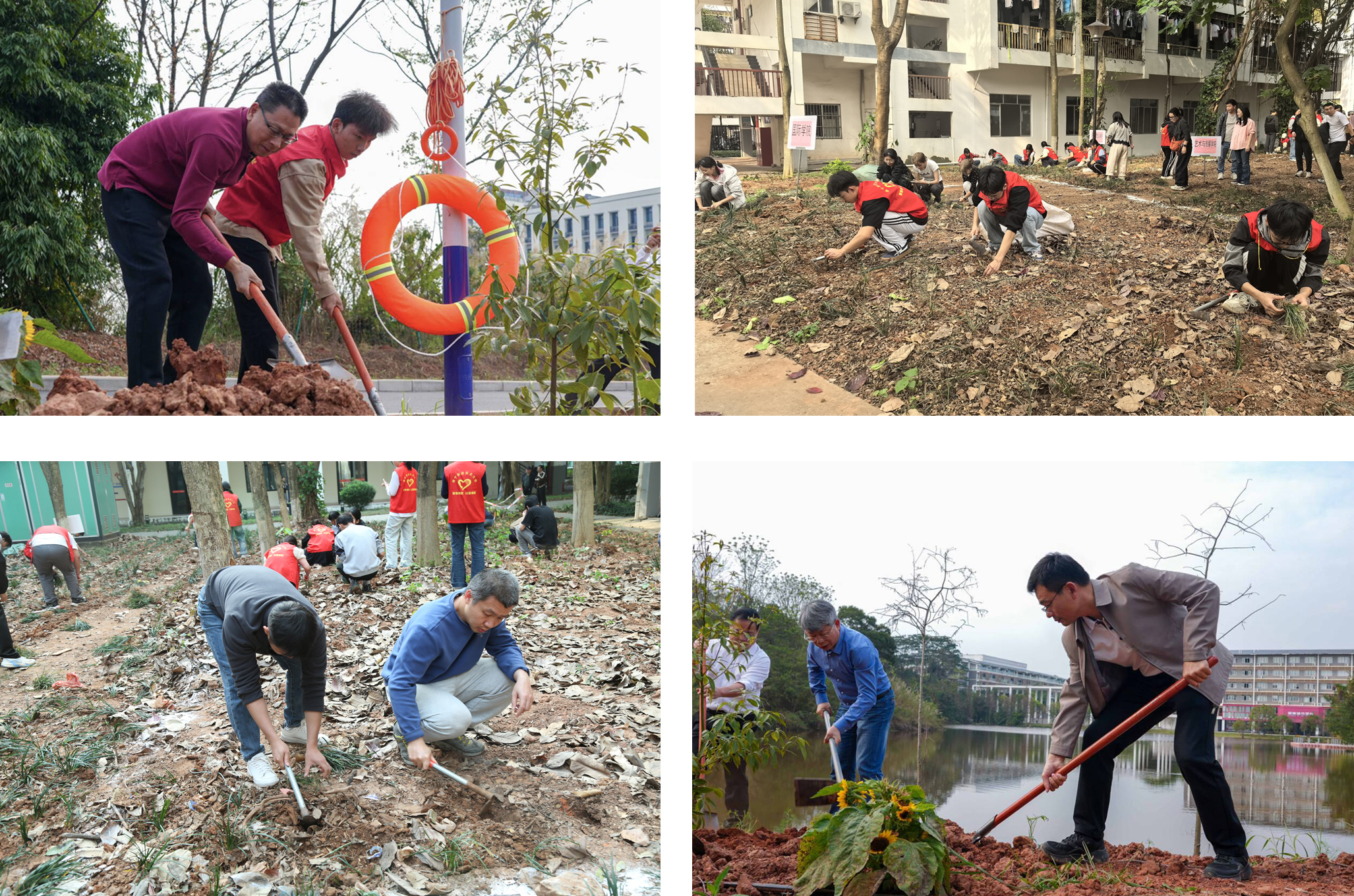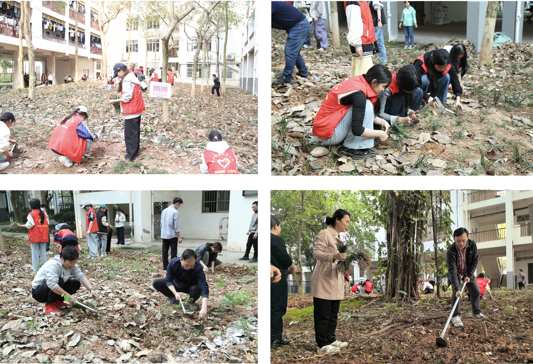 师生在金葵湖畔与宿舍区域栽种金丝楠木树苗及麦冬苗