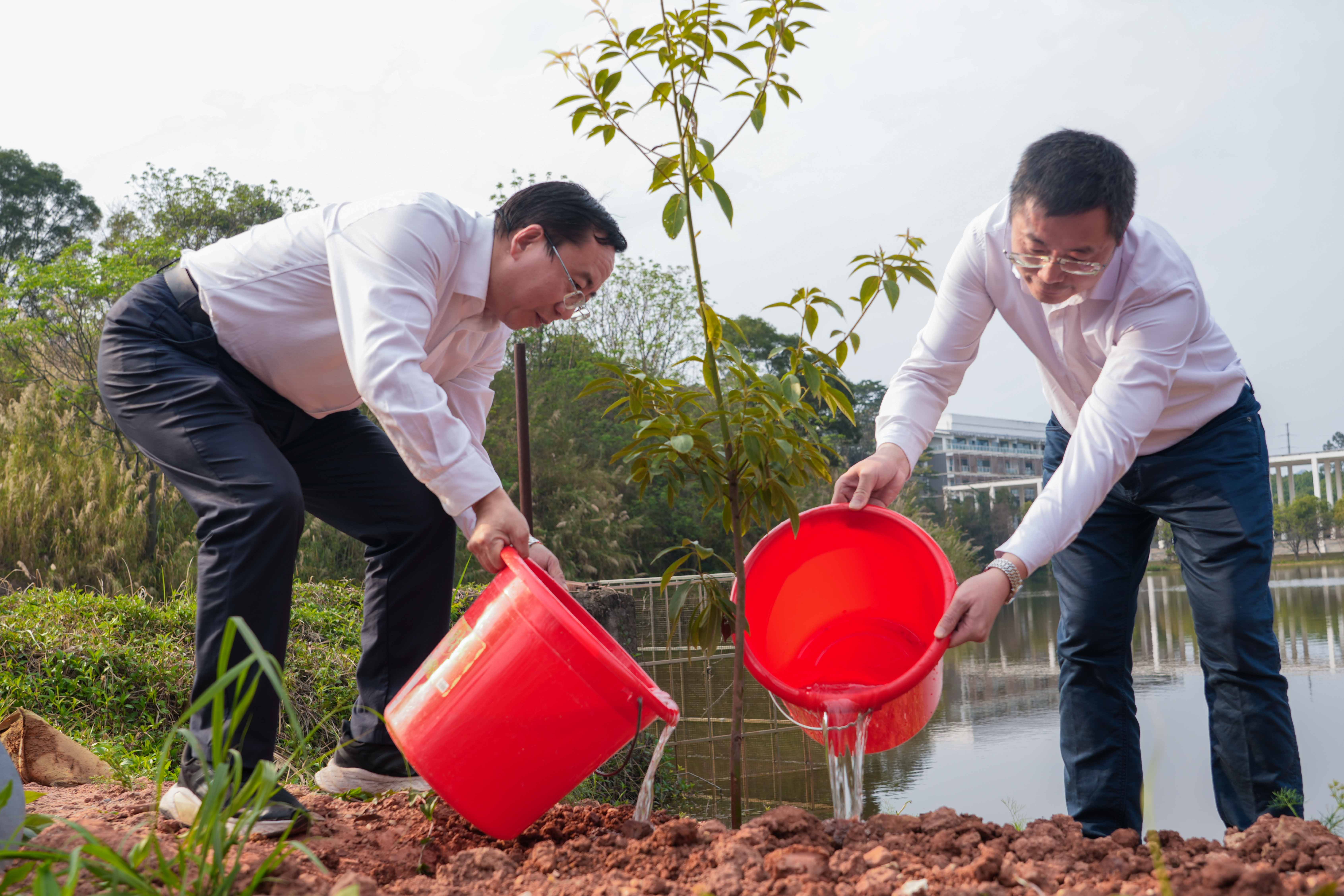 植树现场一片热火朝天。在金葵湖畔,学校党委书记蹇兴超、校长宾月景以及其他校领导率先示范,大家热情高涨地投入到植树活动中。师生们精神饱满、干劲十足,脸上洋溢着劳动的喜悦与对绿色的期盼。大家分工明确、协作默契,有的挥锹挖坑、有的递苗扶株、有的压实土壤、有的提桶浇灌,每一个环节都认真细致、有条不紊,一鼓作气完成了种植任务。大家将金丝楠木树苗及麦冬苗分别栽种于金葵湖边及宿舍区域,进一步丰富了校园植被种类,提升了校园绿化品质。