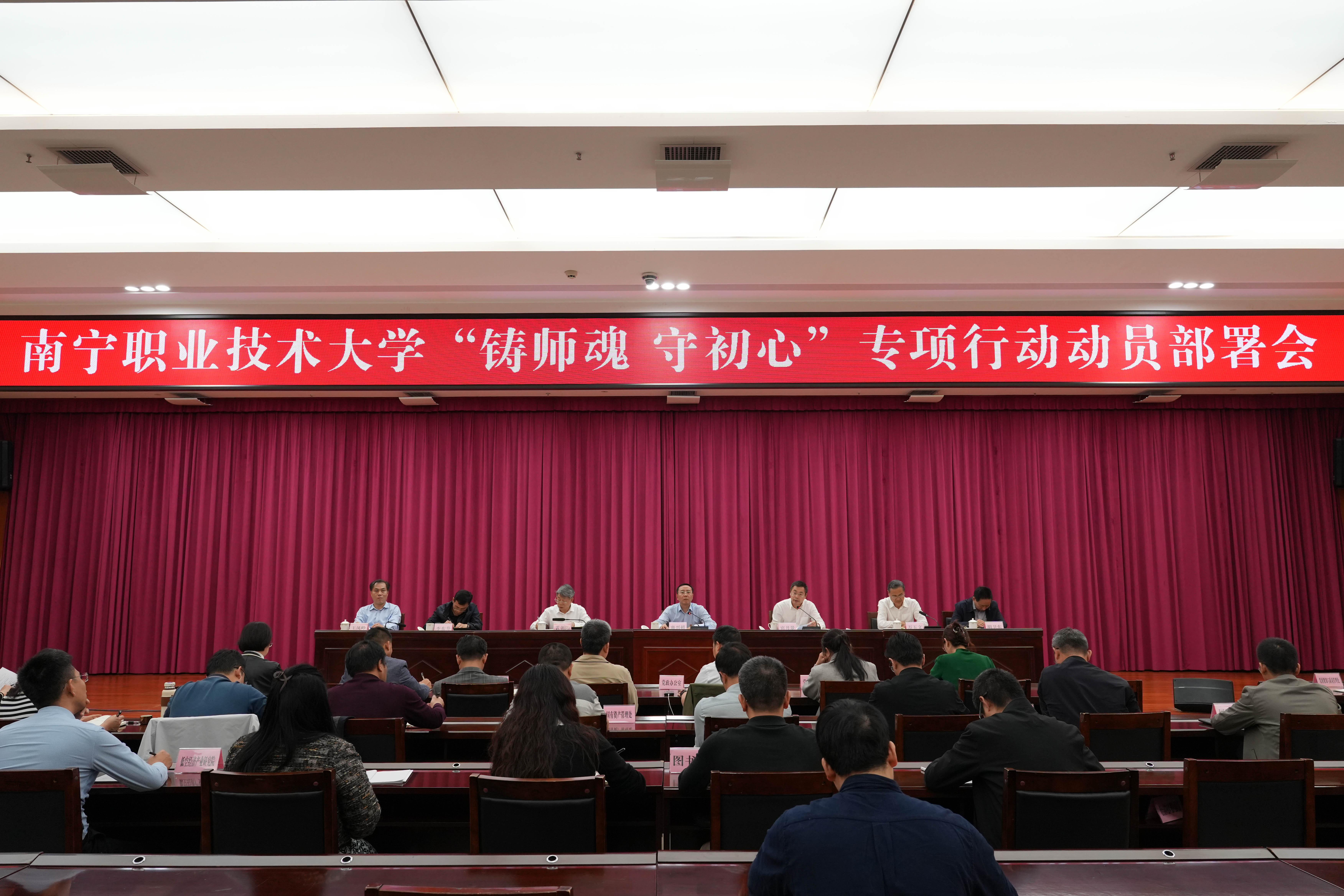 3月18日,我校“铸师魂 守初心”专项行动动员部署会在会议中心二号厅召开。学校党委书记蹇兴超,党委副书记、校长宾月景,党委常委、纪委书记黄朝阳,党委常委、副校长万玉文、李东升、胡卫东、王凤岭出席会议。会议由宾月景主持。
