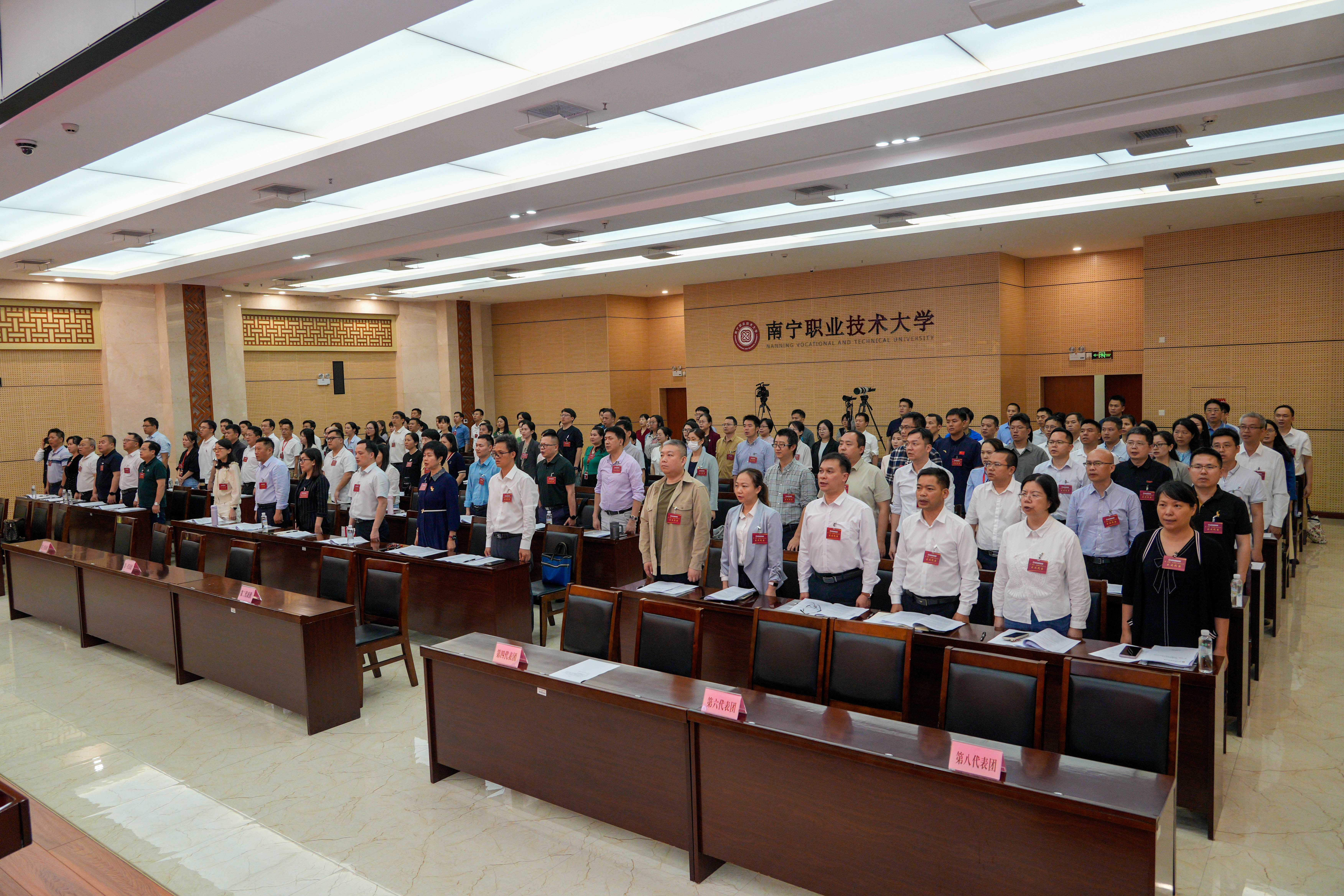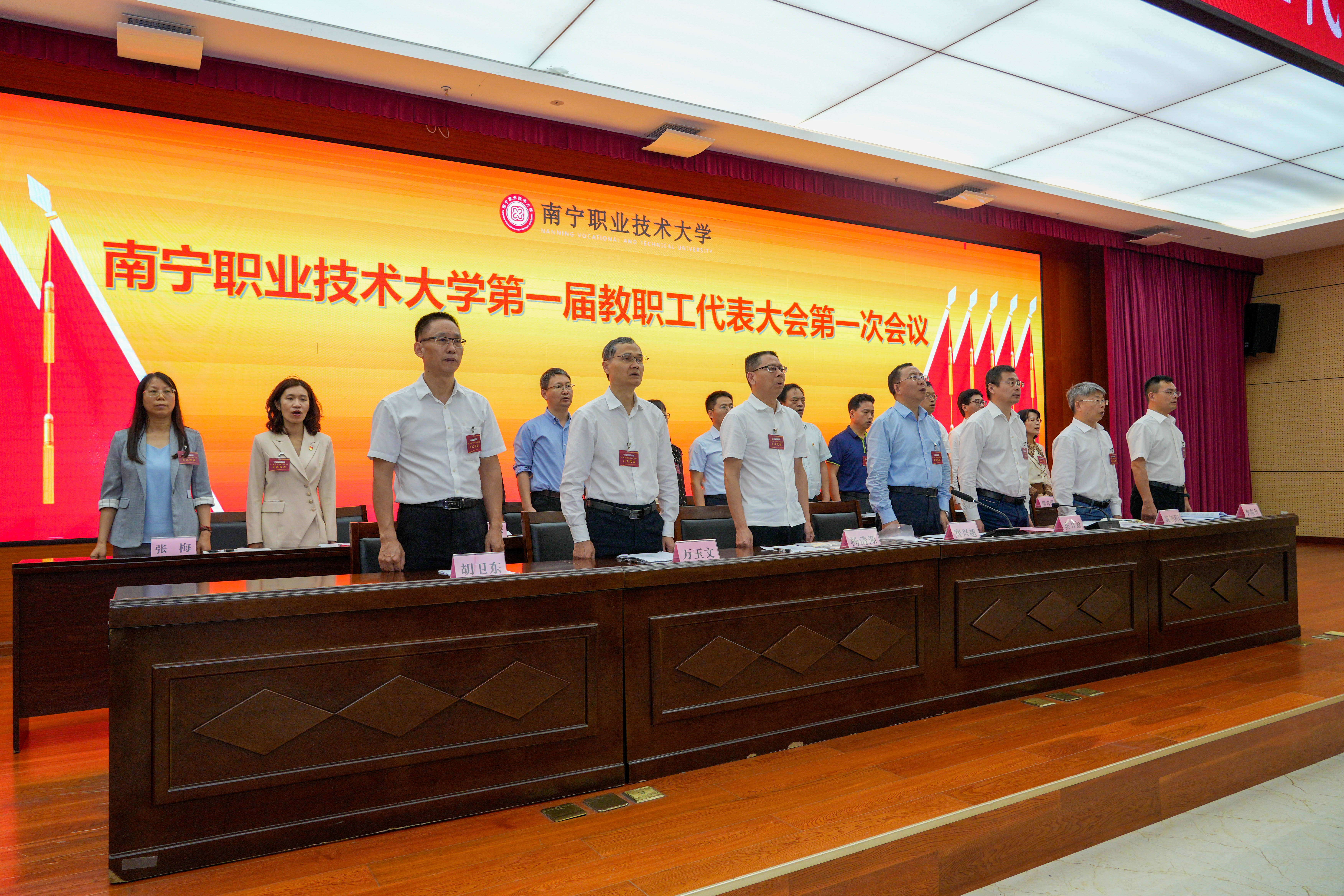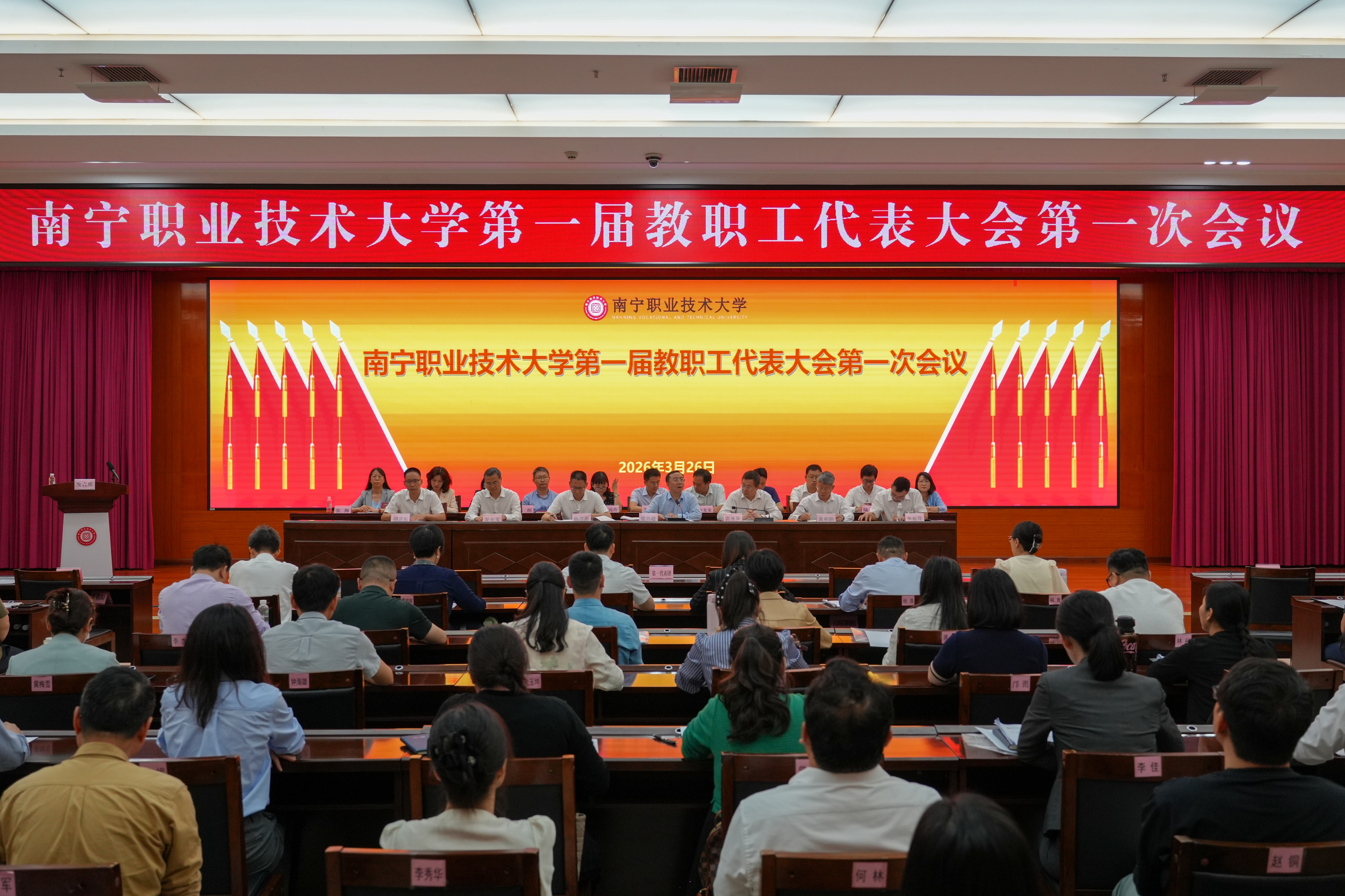 3月26日,南宁职业技术大学第一届教职工代表大会第一次会议在学校会议中心二号厅召开。本次大会是学校升格为本科层次职业大学后的首届教职工代表大会,恰逢“十四五”收官、“十五五”开局的关键时期,意义重大而深远。全校代表齐聚一堂,共商学校发展大计,共绘高质量发展蓝图。学校党委书记蹇兴超,党委副书记、校长宾月景,党委副书记杨清源,党委常委、纪委书记黄朝阳,党委常委、副校长万玉文、李东升、胡卫东出席会议。
