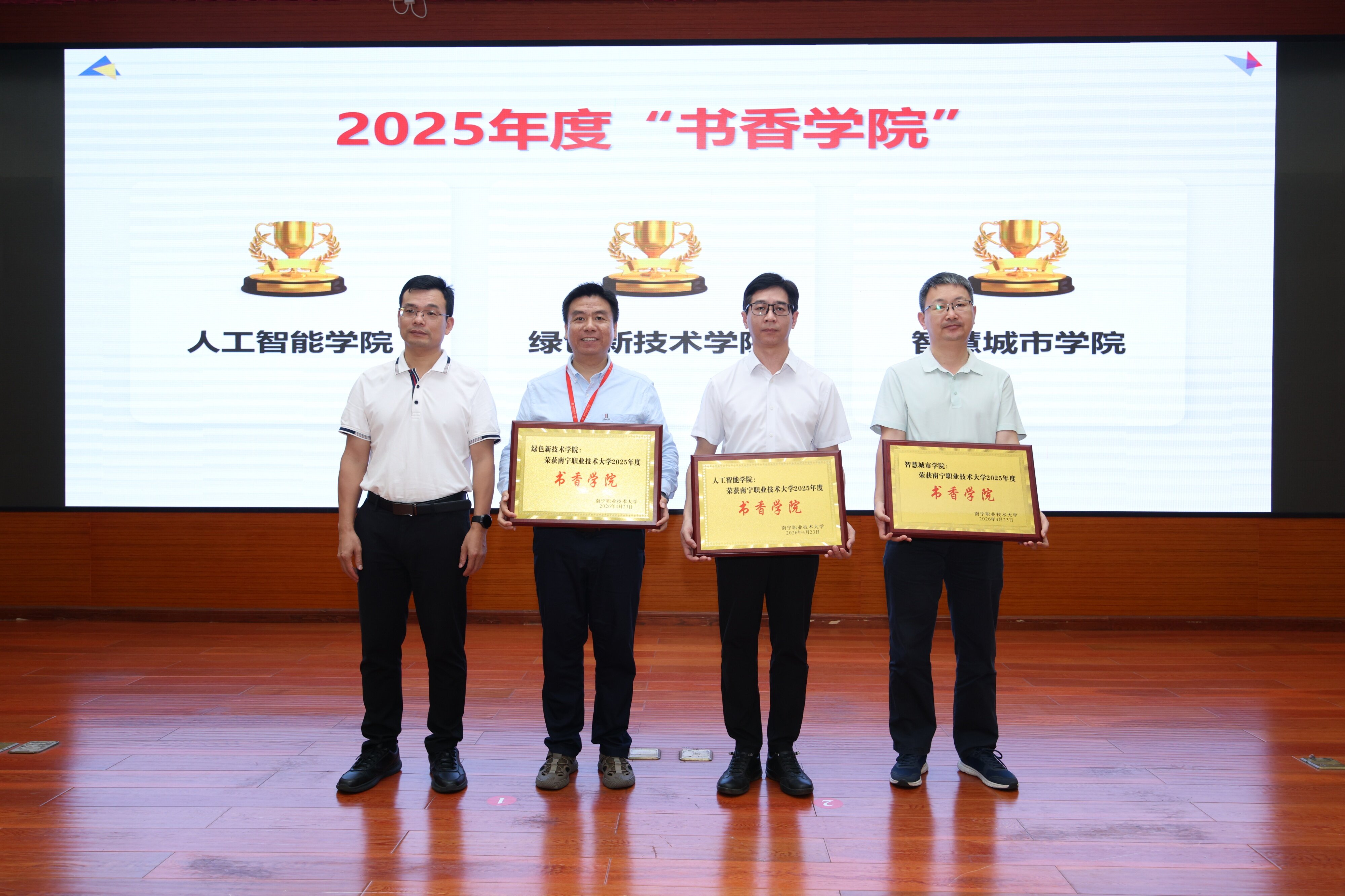 现场还发布了《南宁职业技术大学2025年度阅读工作报告》,并对2025年度在阅读推广工作中表现突出的先进集体和先进个人进行了表彰。人工智能学院、绿色新技术学院、智慧城市学院获评“书香学院”;徐缘等10名辅导员获评“书香辅导员”;25级软件工程3班等10个班级获评“书香班级”;刘红艳等5名教师获评“书香教师”;王乐英等30名学生获评“书香学子”。李东升为“书香学院”“书香辅导员”获奖代表颁奖并合影留念。“书香学院”获奖代表、人工智能学院党委书记陆军,“书香辅导员”获奖代表、数字经济学院辅导员覃维湘,“书香教师”获奖代表、智慧城市学院教师张龙,“书香学子”获奖代表、国际学院学生甘露分别作了经验交流与阅读分享,展现了南职师生“以书为梯、以学促教”的良好风貌。