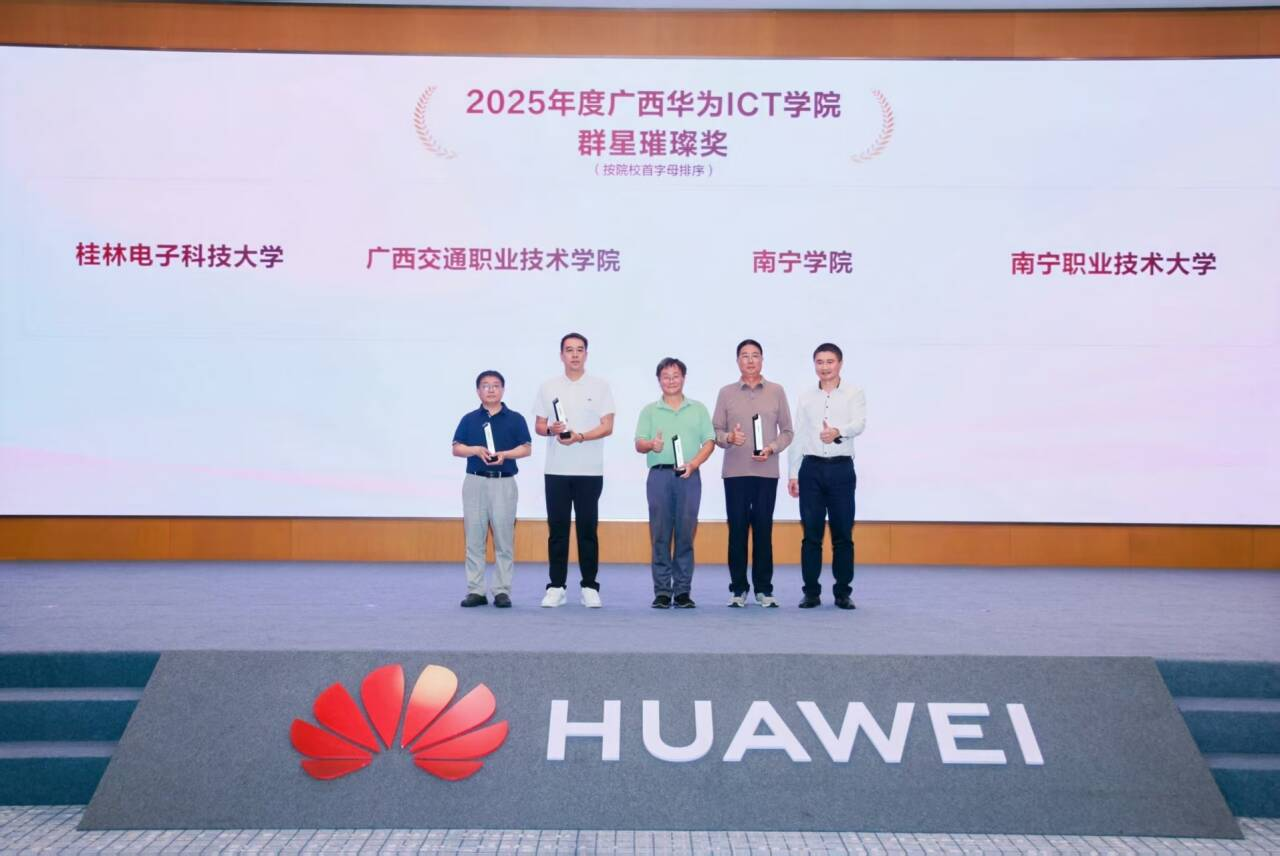 年会期间,人工智能学院院长易著梁代表学校领取了2025年度广西华为ICT学院群星璀璨奖杯,许建豪老师获得2025年度广西华为ICT学院教师硕果盈枝奖,郭佩刚老师获得教师星光领航奖。