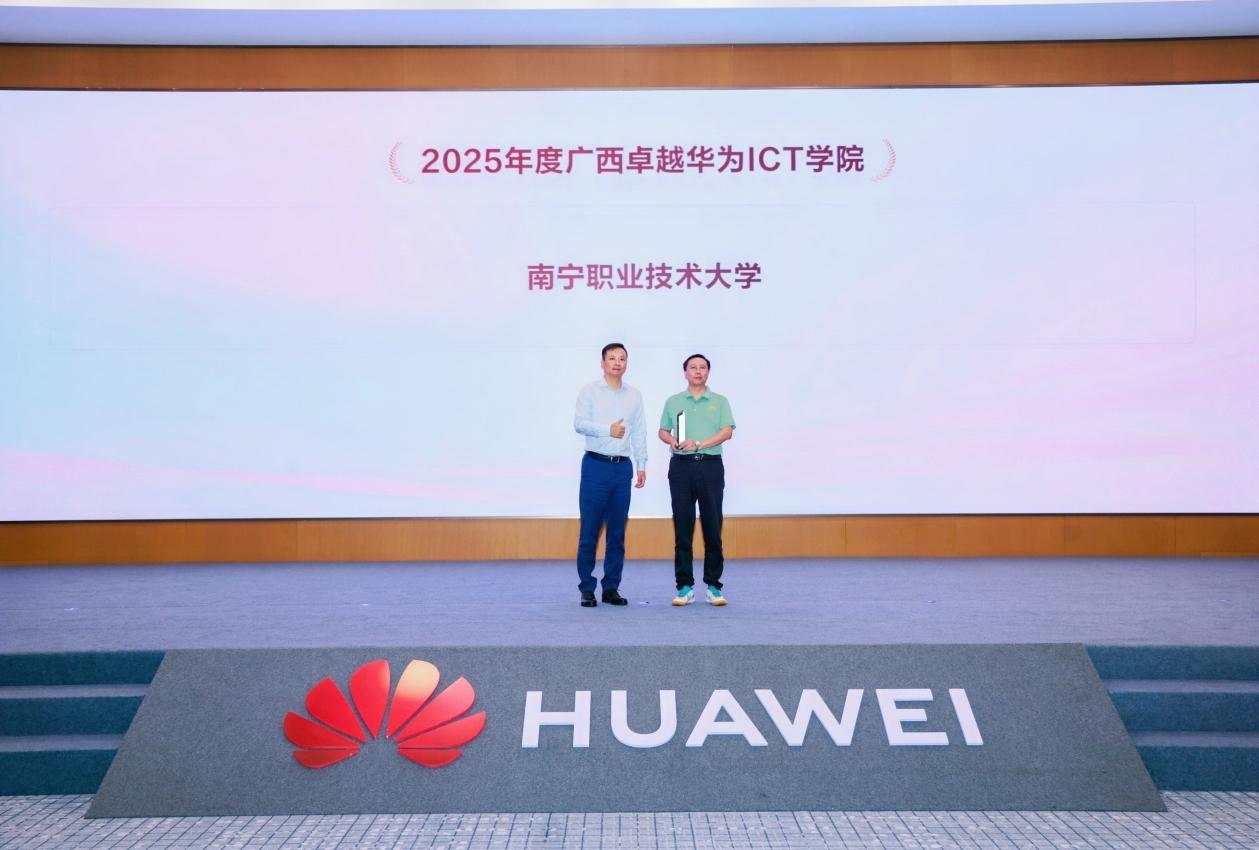 年会颁奖典礼上,我校凭借在ICT人才培养、校企深度合作、教学成果转化等方面的卓越表现,被授予2025年度广西唯一“卓越华为ICT学院”称号,学校党委书记蹇兴超代表学校上台领奖。