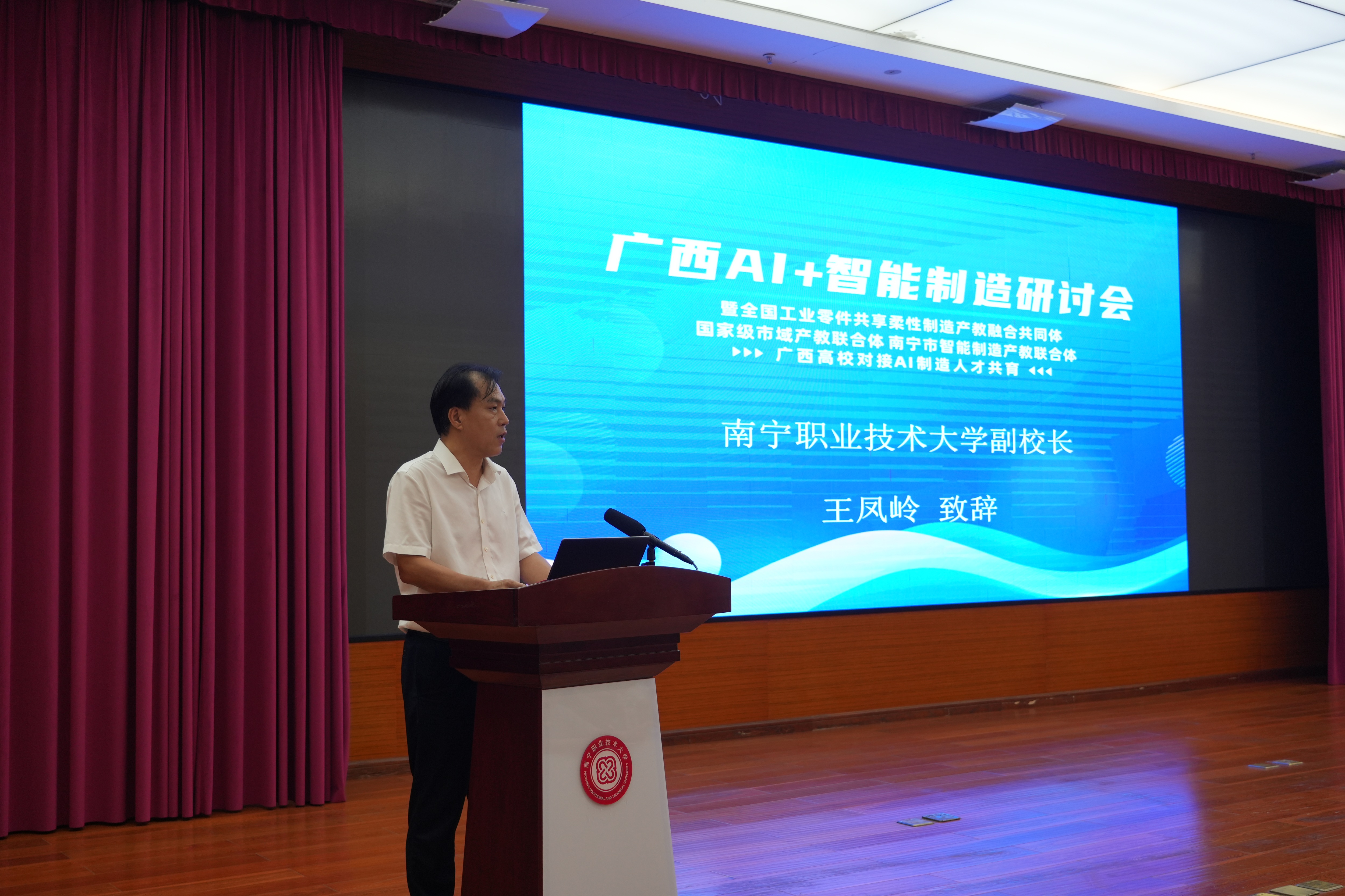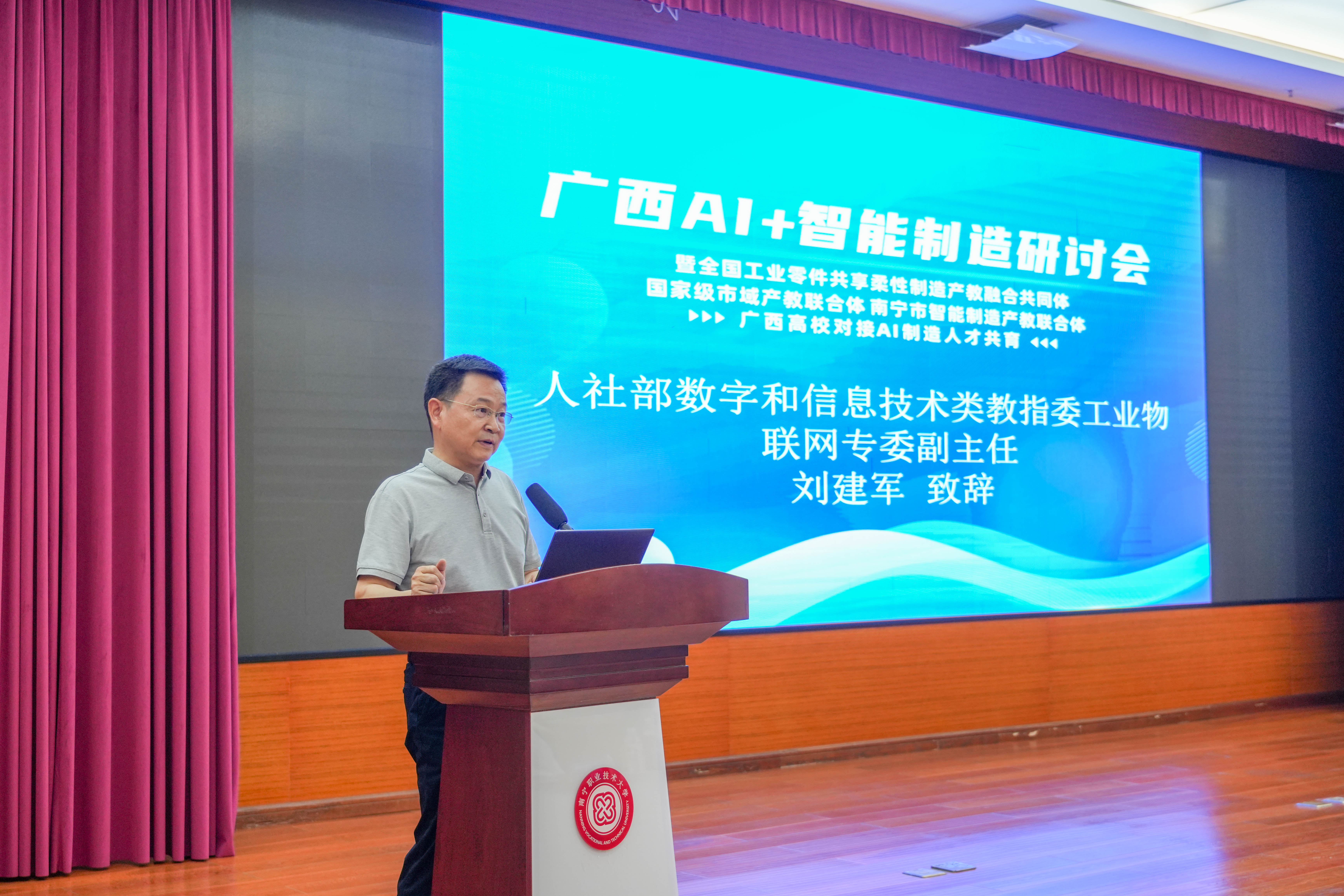 4月24日,广西“AI+制造”产教融合研讨会在南宁职业技术大学(简称南宁职大)举行。学校党委常委、副校长王凤岭出席并致辞。来自国家部委、行业学会、高校及企业的近百位代表齐聚一堂,共谋产教深度融合新路径。
