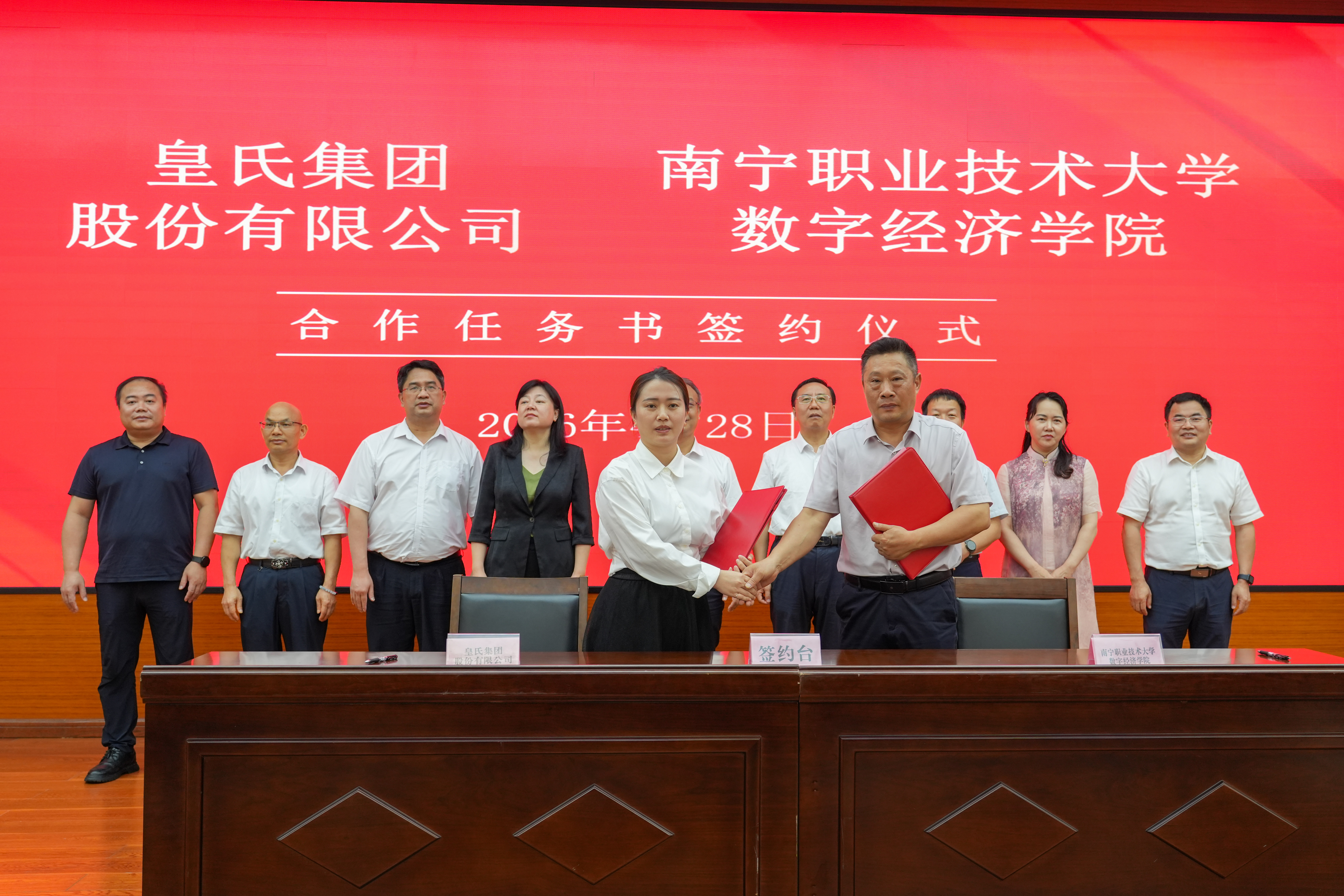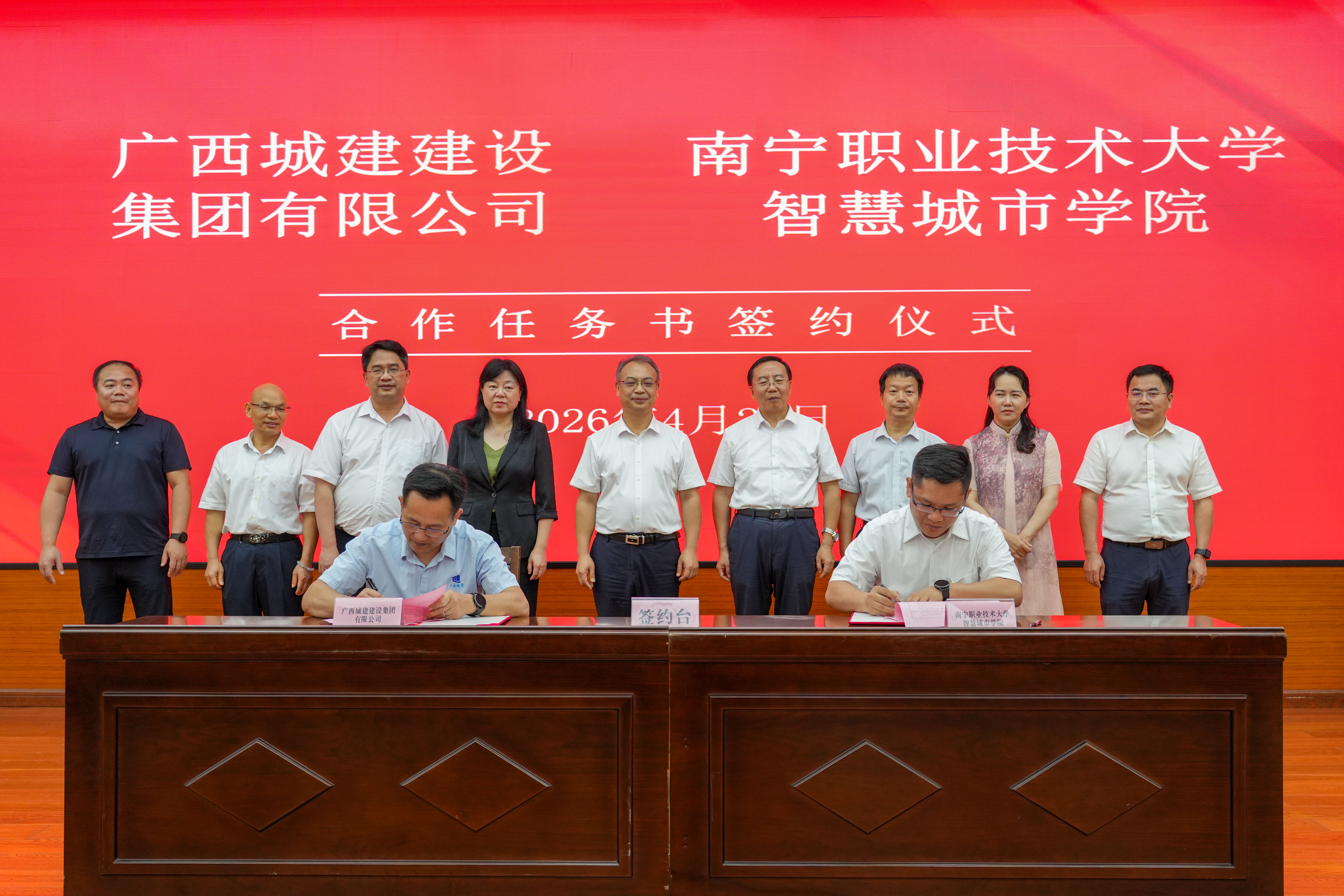 在与会嘉宾的共同见证下,双方正式签署产教融合人才培养战略合作协议。广西城建建设集团有限公司、皇氏集团股份有限公司、广西品格智造数字化工业有限公司分别与我校智慧城市学院、数字经济学院、人工智能学院签署合作任务书。