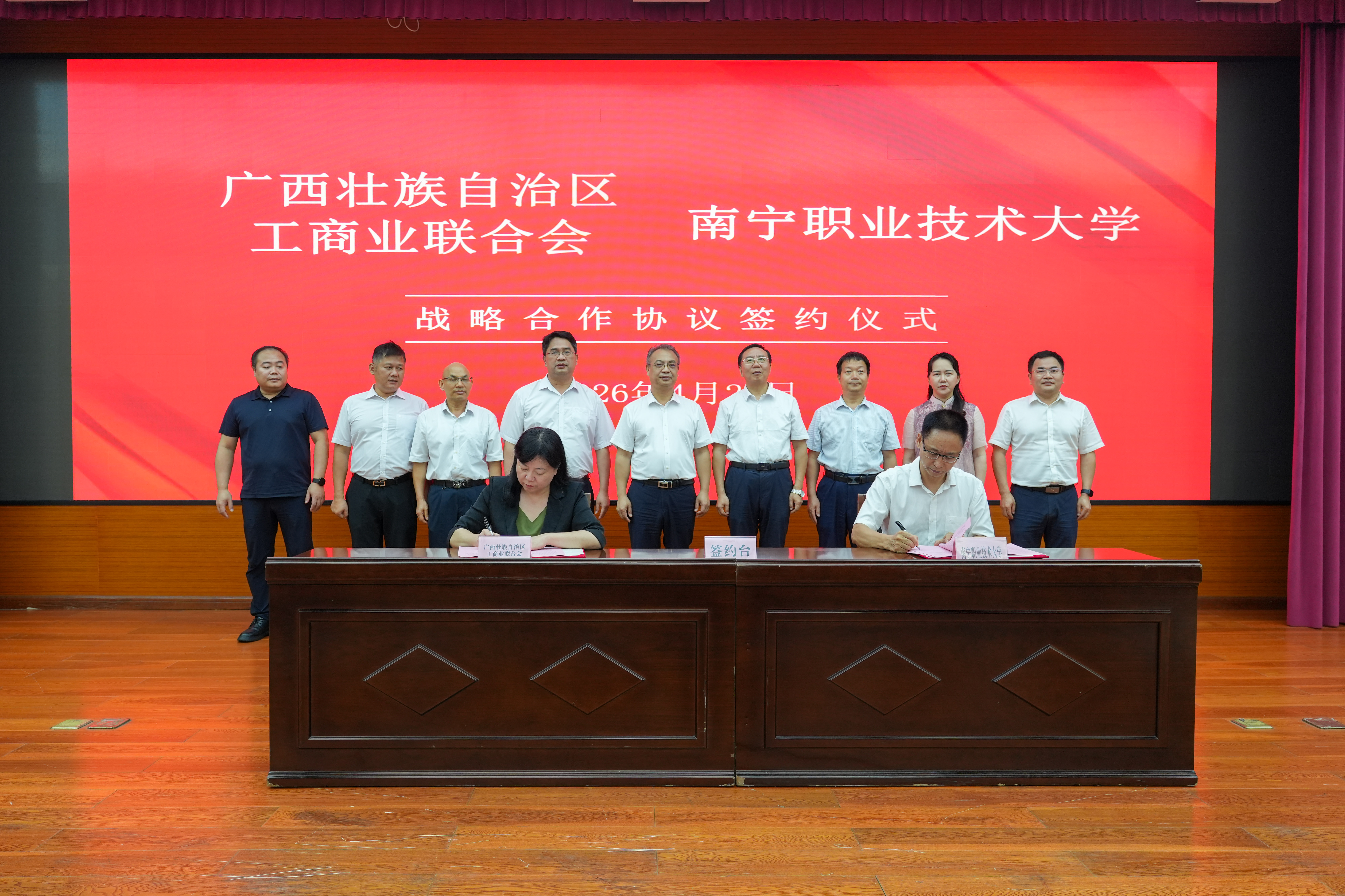 4月28日,广西壮族自治区工商业联合会与南宁职业技术大学政校企供需对接座谈会暨产教融合人才培养战略合作签约仪式在我校会议中心二号厅举行。自治区党委统战部副部长、自治区工商联党组书记邓国忠,南宁职业技术大学党委书记蹇兴超,南宁职业技术大学党委副书记、校长宾月景,自治区工商联副主席熊智琳,南宁职业技术大学党委常委、副校长胡卫东等领导出席活动。