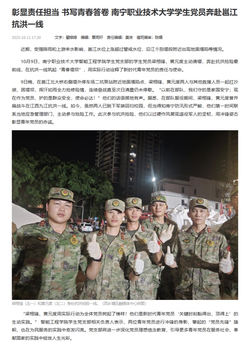 彰显责任担当 书写青春答卷 南宁职业技术大学学生党员奔赴邕江抗洪一线